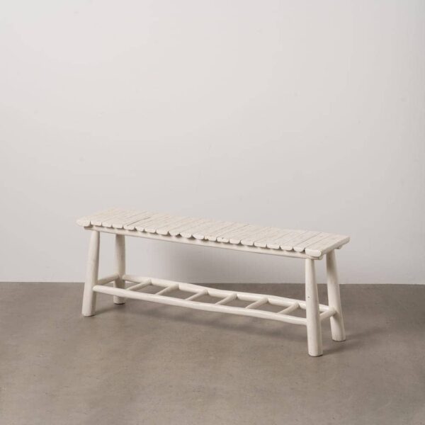 Su acabado en blanco rozado añade un aire fresco y cálido, capaz de combinar con una amplia variedad de estilos decorativos. Las patas de madera de teca, con una altura de solo 11 cm, proporcionan estabilidad y un diseño minimalista, perfecto para integrarse en espacios modernos o de estilo rústico. Además, su estructura robusta permite soportar hasta 11.6 kg, siendo una opción ideal para complementar tu salón, pasillo o incluso como asiento adicional en la entrada.