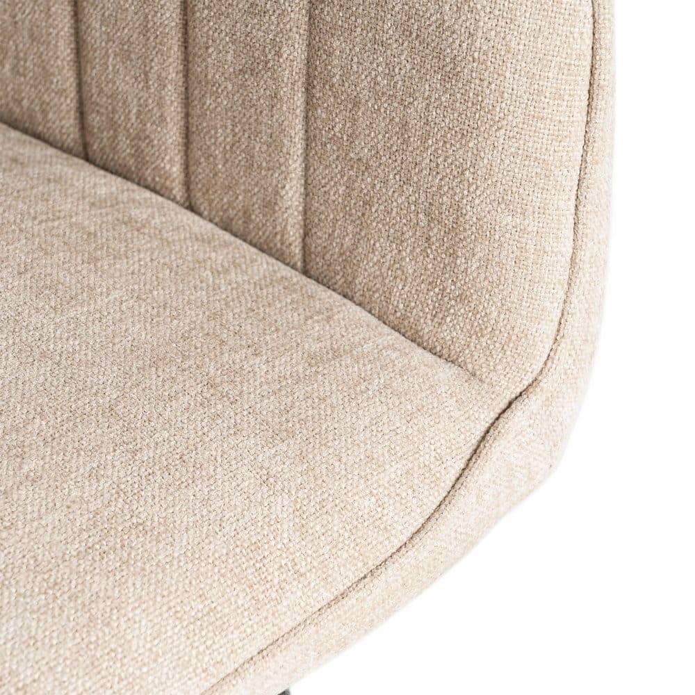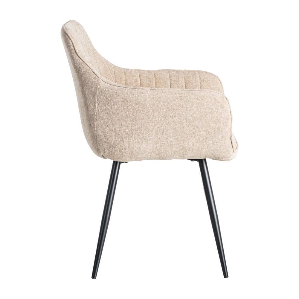 Material: tejido, metal. Altura asiento: 47cm. Ancho asiento: 40cm. Profundidad asiento: 46cm. Altura respaldo: 40cm. Altura reposabrazos: 20cm (65cm desde el suelo). No apilable. Cuample la normativa EN16139 (catering).