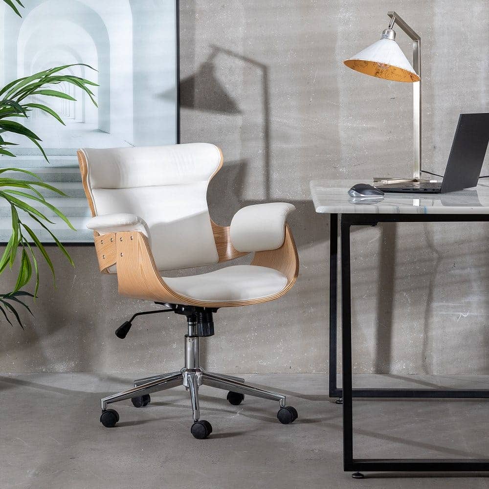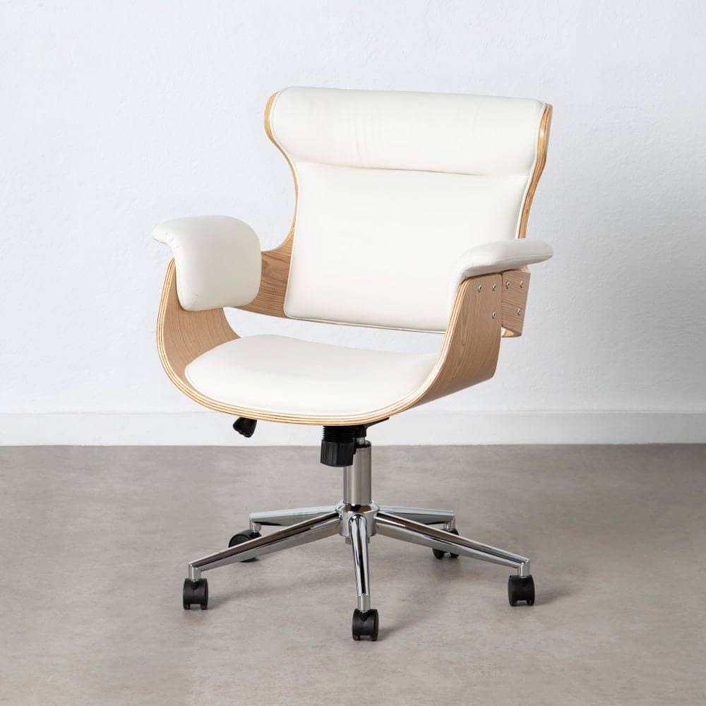 La Silla de Oficina Claude Blanca es perfecta para quienes buscan comodidad y estilo. Su tapizado en poliuretano imitación piel de alta calidad, junto con el respaldo de madera conglomerada de nogal, le otorgan un toque refinado y duradero. Con una altura de asiento ajustable entre 43 y 52 cm, se adapta perfectamente a tu postura, mientras que sus reposabrazos alcanzan una altura mínima de 65,5 cm. Además, su estructura giratoria y las patas de hierro cromado le proporcionan la estabilidad y movilidad necesarias. Su profundidad de asiento de 41 cm y el ancho de 45 cm aseguran una experiencia ergonómica. Además, cumple con la normativa EN1335, lo que garantiza su fiabilidad y resistencia. ¡Añade un toque de distinción y confort a tu oficina con la silla Claude!