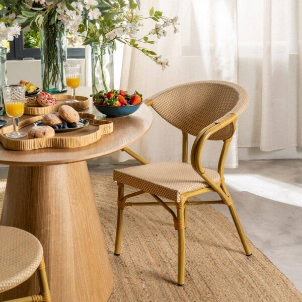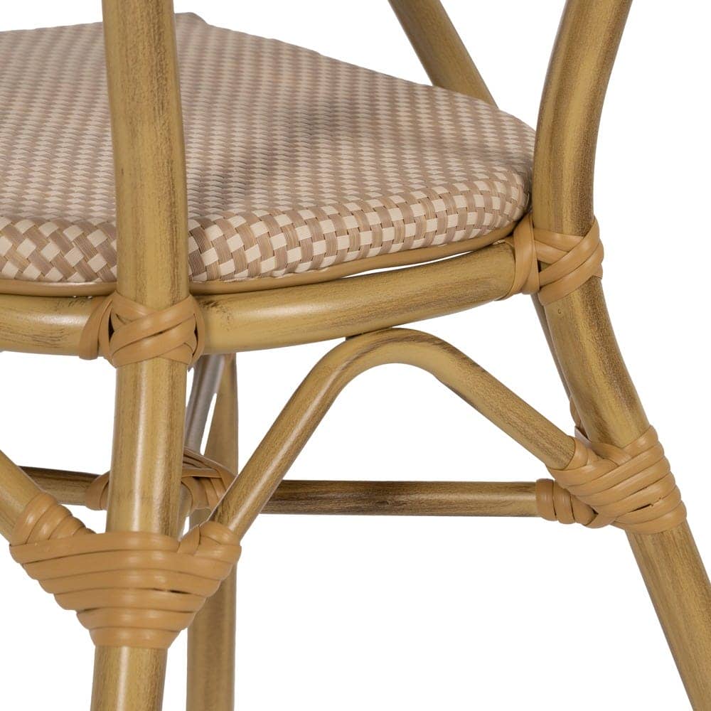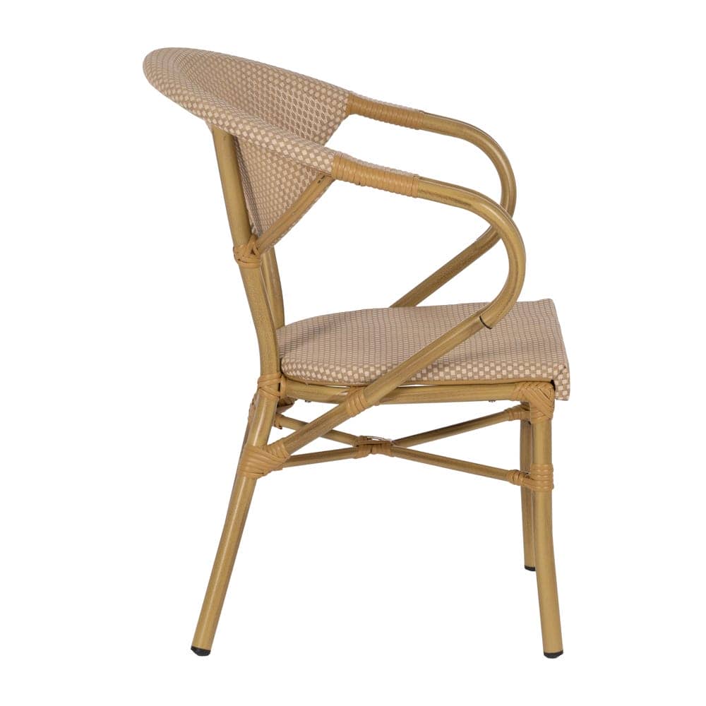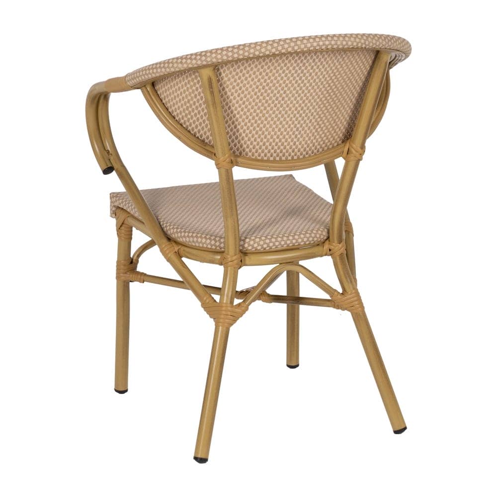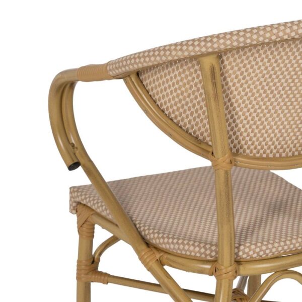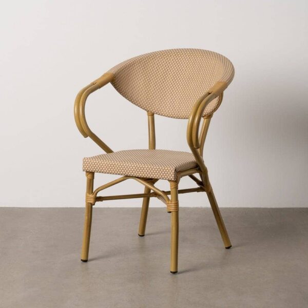 Material: aluminio, textileno. Altura asiento: 43cm. Ancho asiento: 40cm. Profundidad asiento: 42cm. Altura respaldo: 43cm. Altura reposabrazos: 28cm (71cm desde el suelo). Apilable.