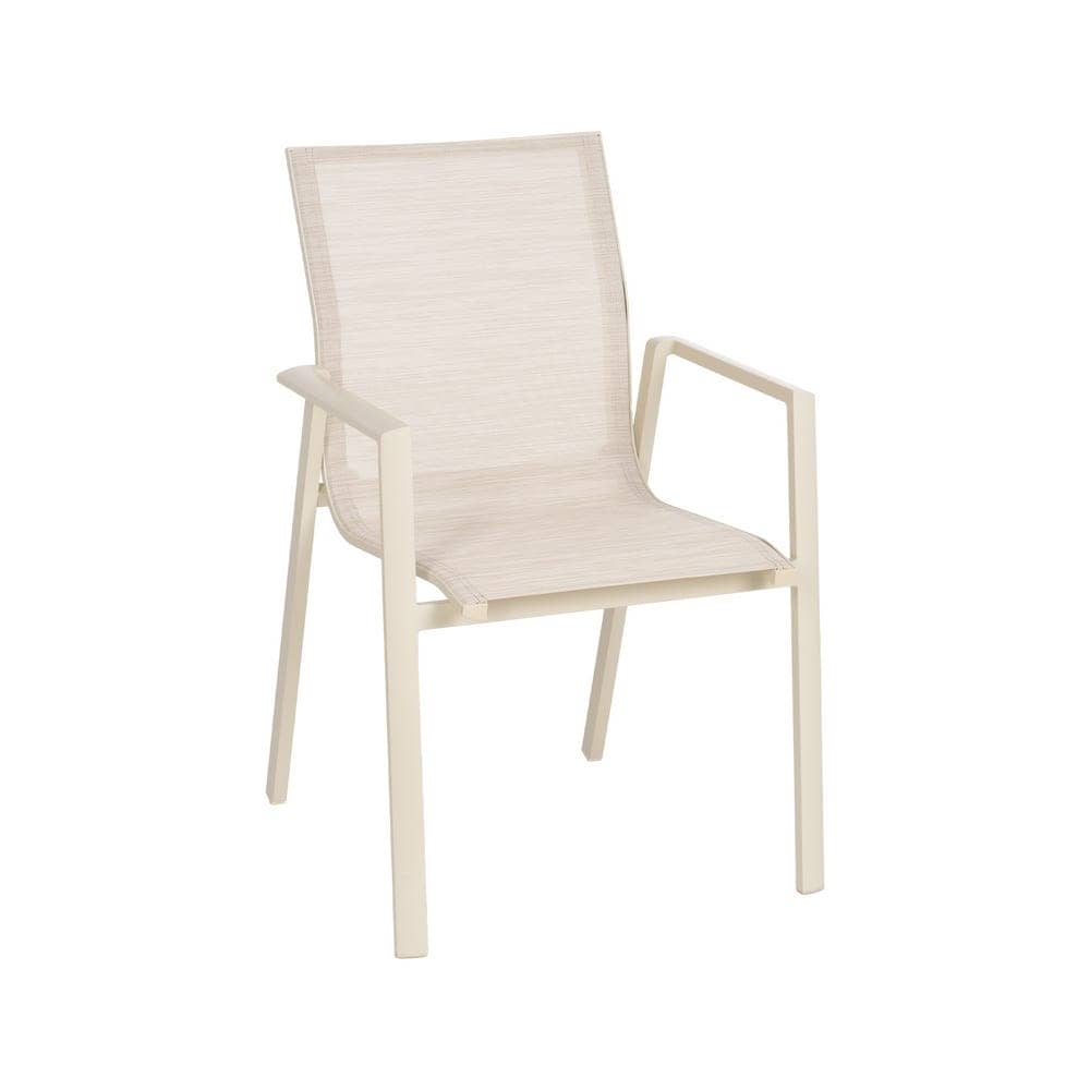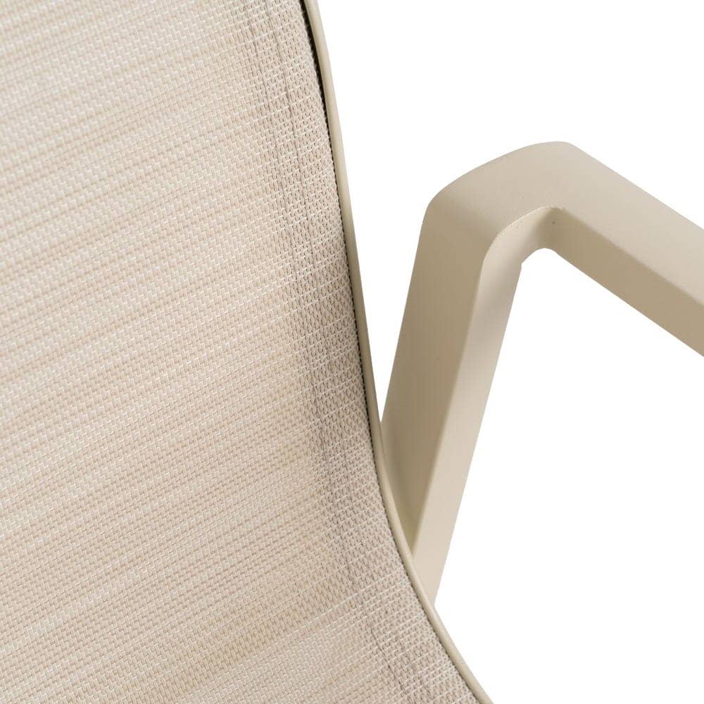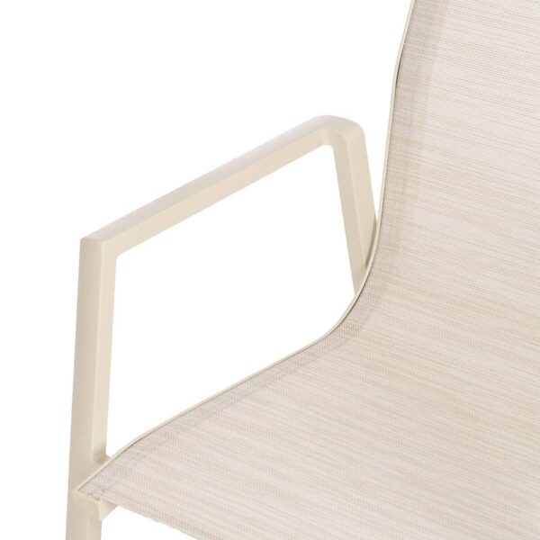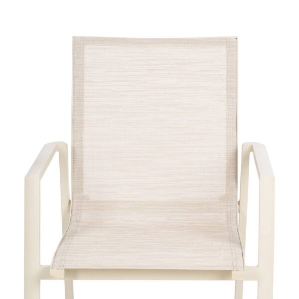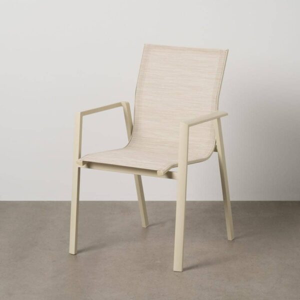 Material: aluminio, textileno (70% PVC, 30% poliéster). Altura asiento: 44,5cm. Profundidad asiento: 41cm. Ancho asiento: 43,5cm. Altura respaldo: 45cm. Apilable. Cumple la normativa EN581 (uso exterior).