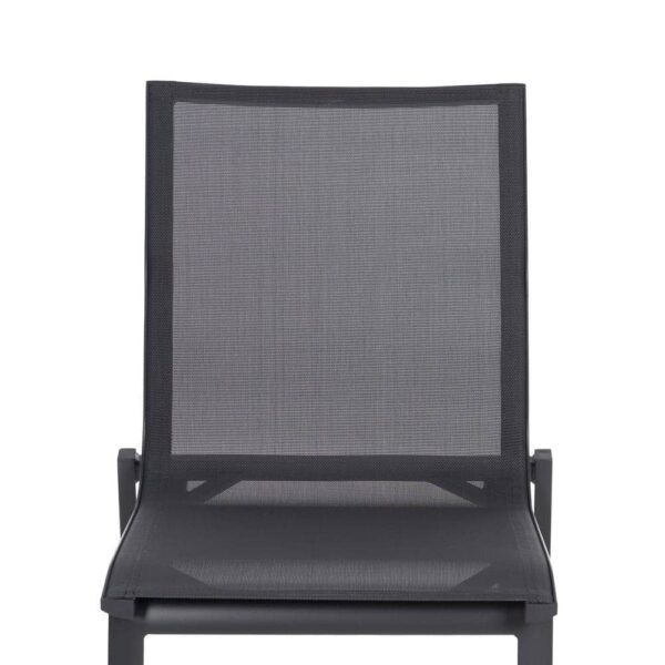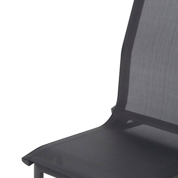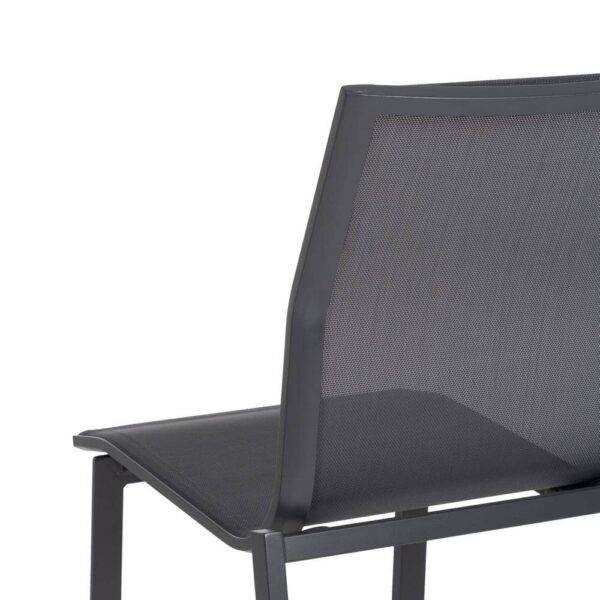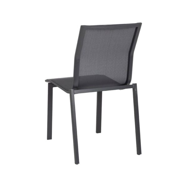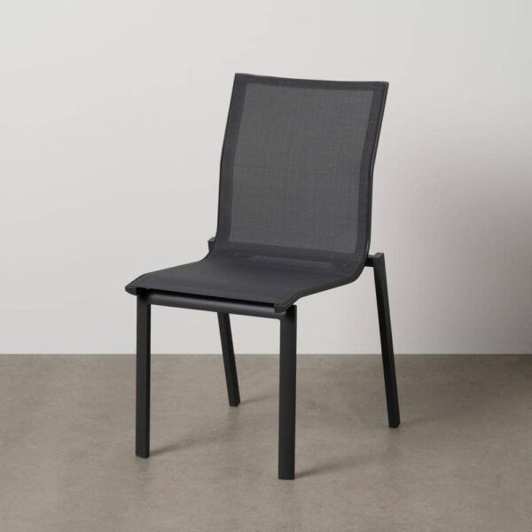 Material: aluminio, textileno (70% PVC, 30% poliéster). Altura asiento: 45cm. Profundidad asiento: 41cm. Ancho asiento: 43,5cm. Altura respaldo: 45cm. Apilable. Cumple la normativa EN581 (uso exterior).