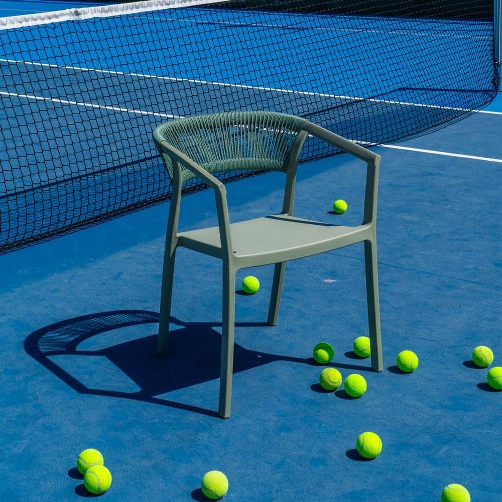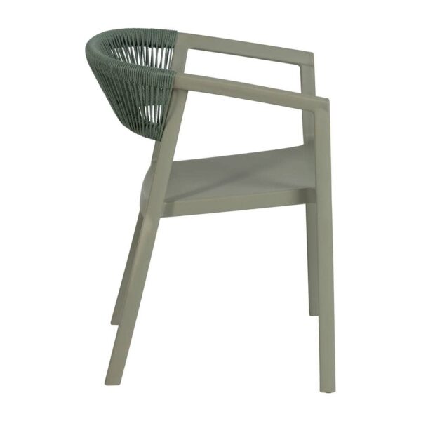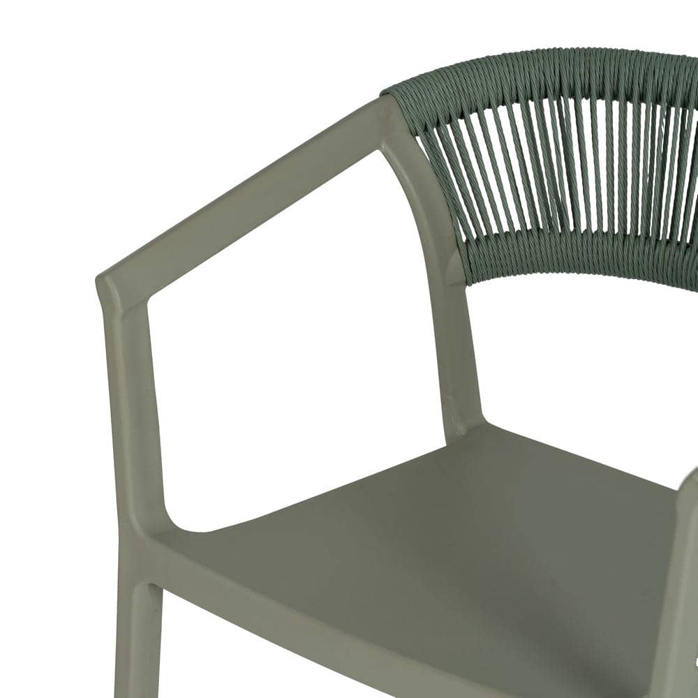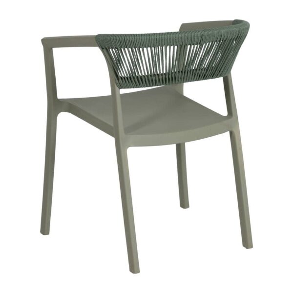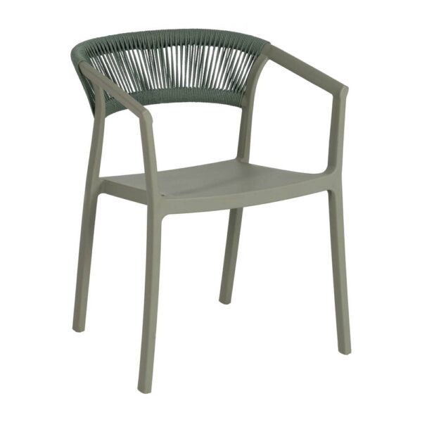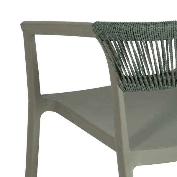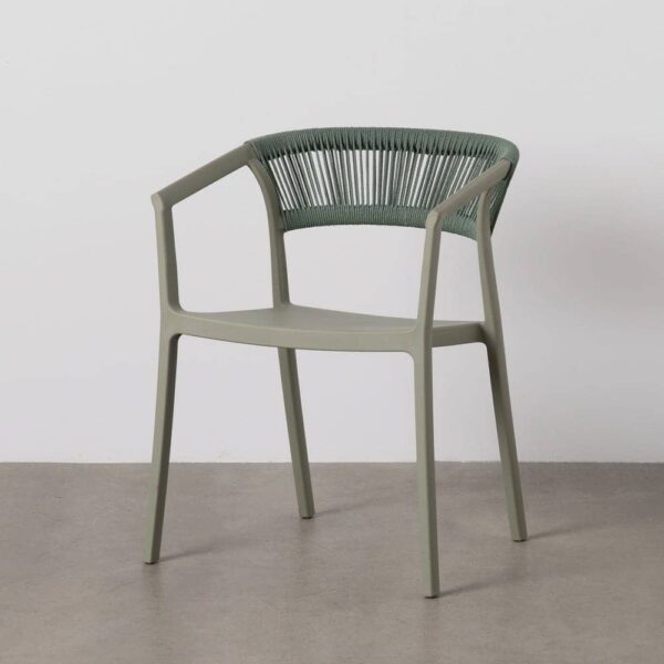 Materiales: Polipropileno, cuerda de polietileno. Altura patas:42cm. Altura respaldo:36cm. Altura del asiento:45,5cm. Medidas del asiento:42,5×40,5cm. Diatancia entre las patas:51cm. Altura del brazo al asiento:22cm (68cm desde el suelo). Peso máximo soportado:150kgs. No requiere montaje. Apilable. Cumple con la normativa UNE-EN 16139:2013