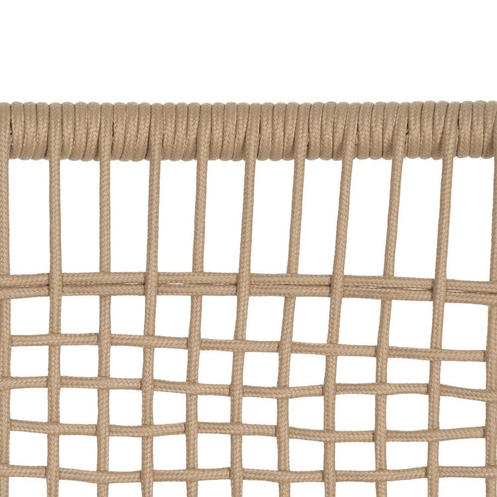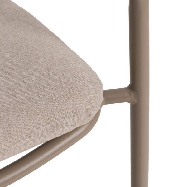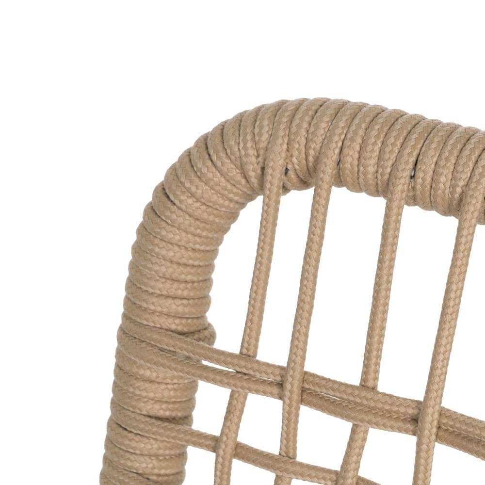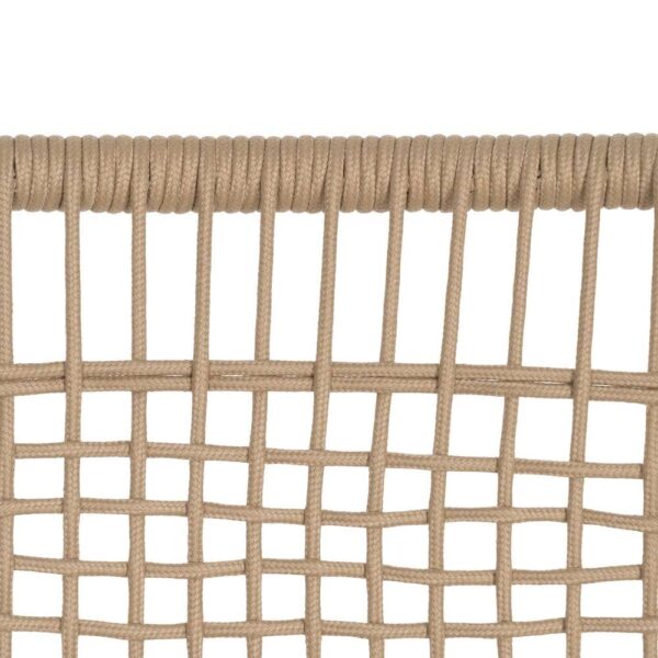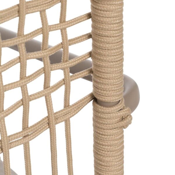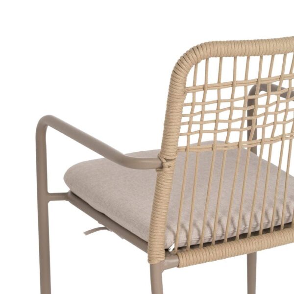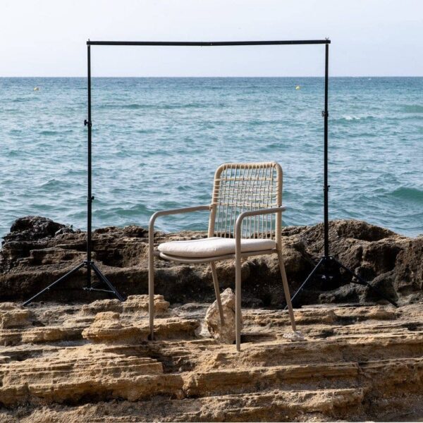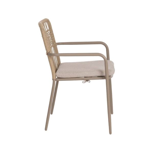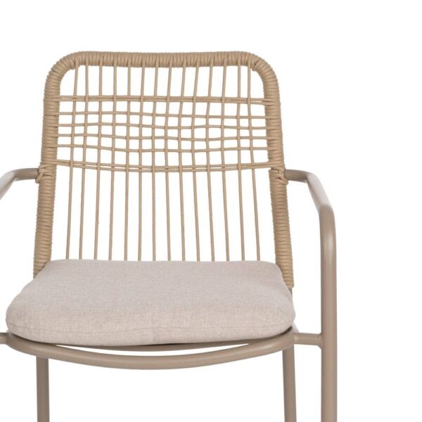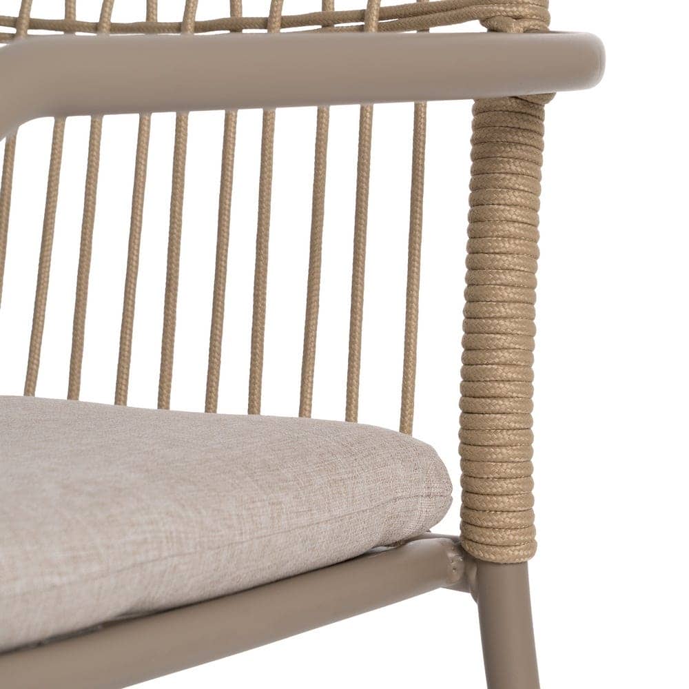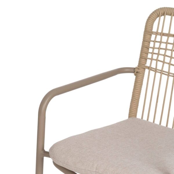 Material: aluminio. Tejido 100% olefina. Relleno: 4cm de foam + algodón. Altura asientos: 50cm. Ancho asiento: 44cm. Profundidad asiento: 46cm. Altura respaldo: 41cm. Cojín desenfundable. Cumple la normativa EN581 (uso exterior). Los muebles y productos de exterior son aptos para permanecer a la intemperie durante la temporada, sin embargo se recomienda colocarlos bajo techado o protegerlos de la lluvia, ya que el tejido no es a prueba de agua. Una vez acabada la temporada, se recomienda guardar o proteger adecuadamente para asegurar su mantenimiento.