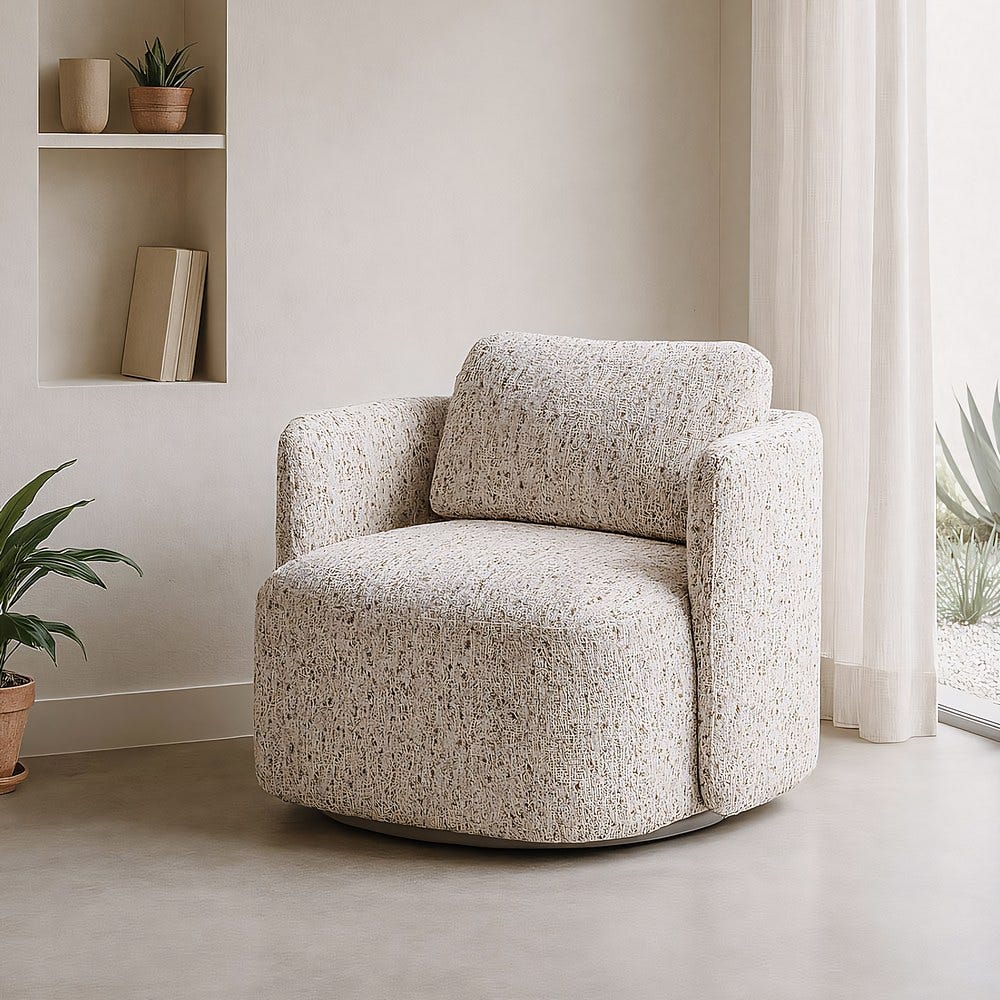 Sillón giratorio beige tapizado en tela para salón – 87 x 85 x 66 cm