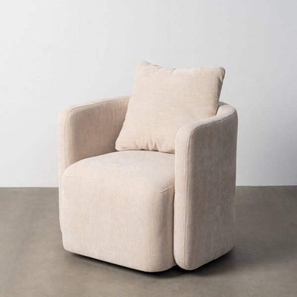 Material: tejido 100% poliéster – estructura madera conglomerada y hierro. Cojín desenfundable con cremallera. Medida cojín: 43x43cm. Relleno: foam Altura asiento: 44cm. Altura reposabrazos: 63cm. No precisa montaje. Cumple normativa EN12520:2016