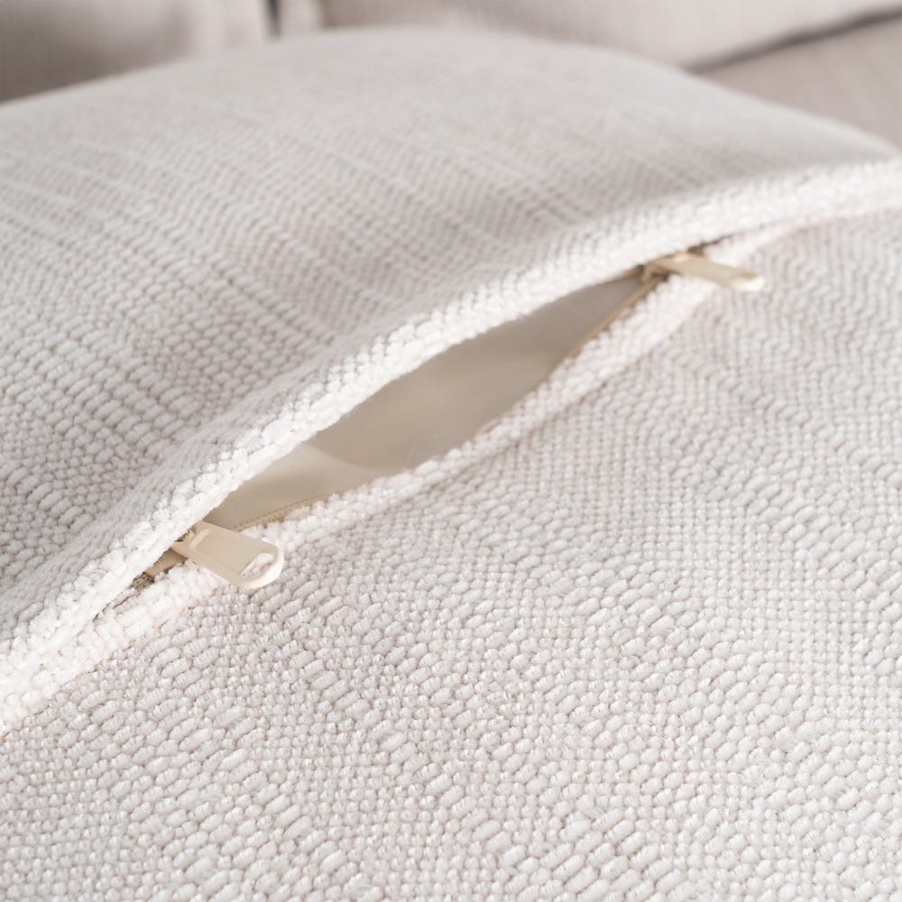 Material: tejido 100% poliéster Relleno asientos: doble pluma. Altura asiento: 51cm. Altura respaldo: 47cm. Patas para montar Se recomienda limpieza en seco. Sofá completamente desenfundable.