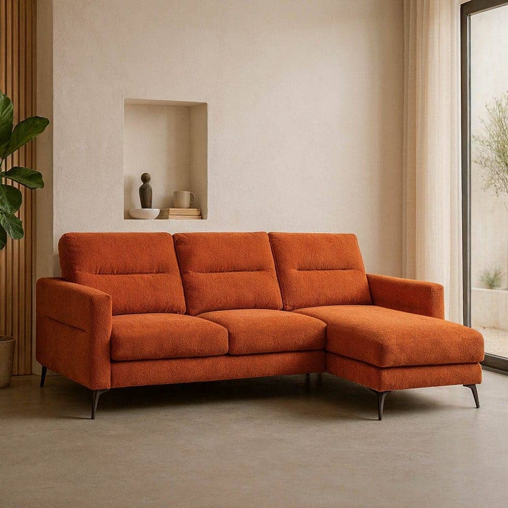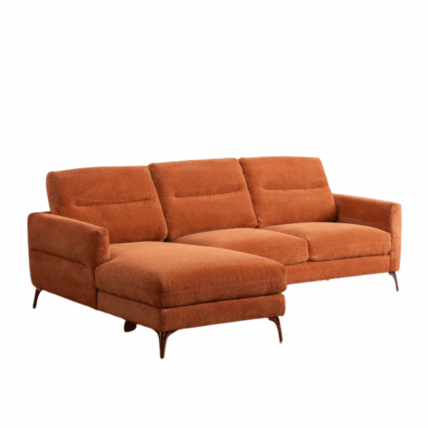 Material: tejido(100% poliéster). Estructura: madera de eucalipto. Relleno: PU foam, densidad 25. Altura asiento: 46cm. Ancho asiento: 210cm. Profundidad asiento: 55cm/125cm. Altura respaldo: 50cm. Altura reposabrazos: 20cm. Altura patas: 15cm. 2 bultos de 150x86x87,5cm y 86x157x87,5cm. Peso máximo sorportado: 350kg. Cumple la normativa EN12520 (uso doméstico).