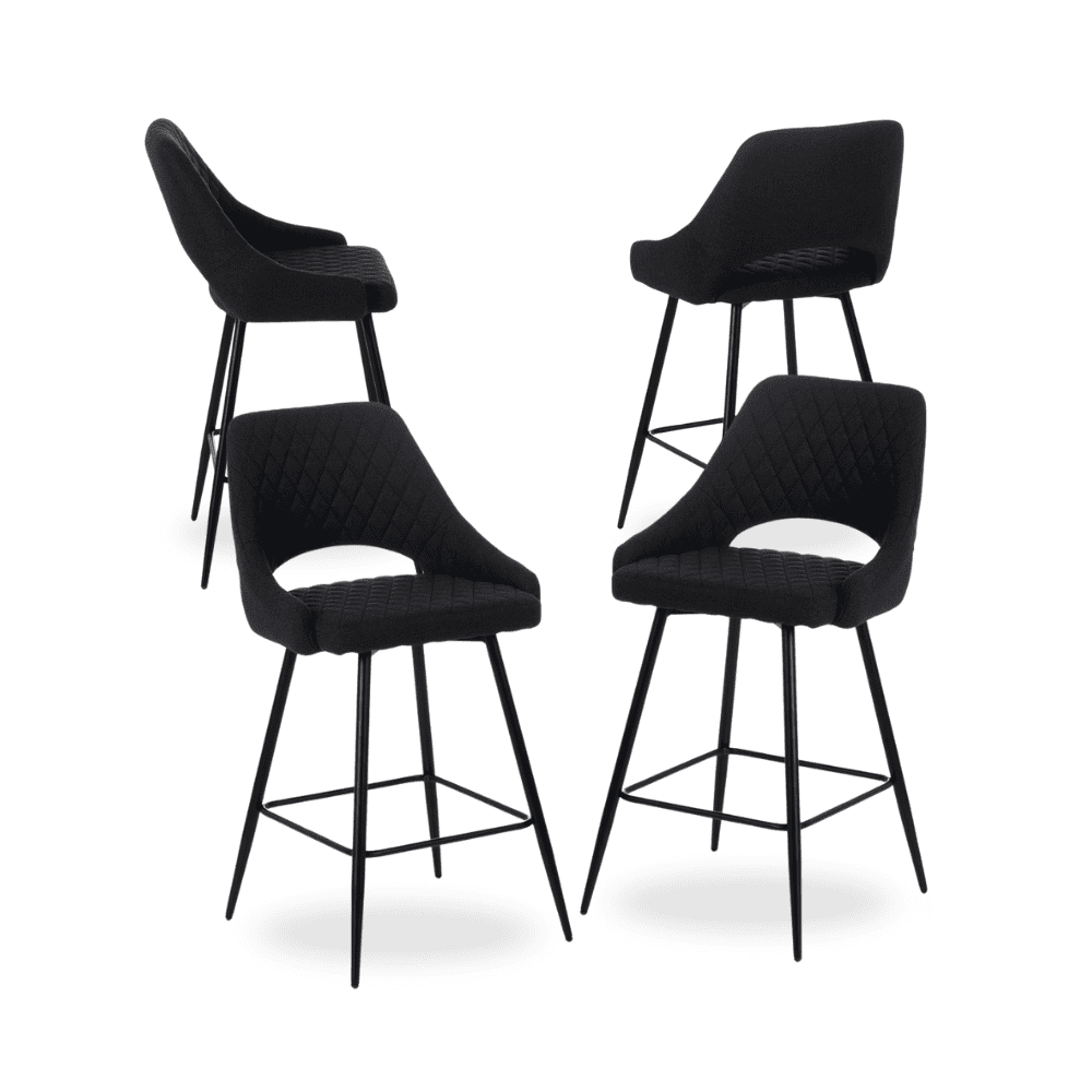 Aporta un toque de elegancia y modernidad a tu hogar con el Pack de 4 Taburetes Negro. Este diseño combina un tapizado de tejido negro 100% poliéster con una robusta estructura metálica de hierro, logrando una estética minimalista pero sofisticada. Con un respaldo ergonómico de 34,5 cm y un asiento a 64 cm de altura, este taburete garantiza comodidad sin renunciar al estilo.