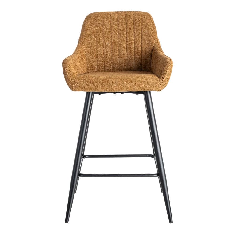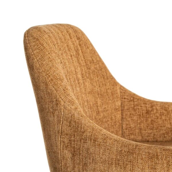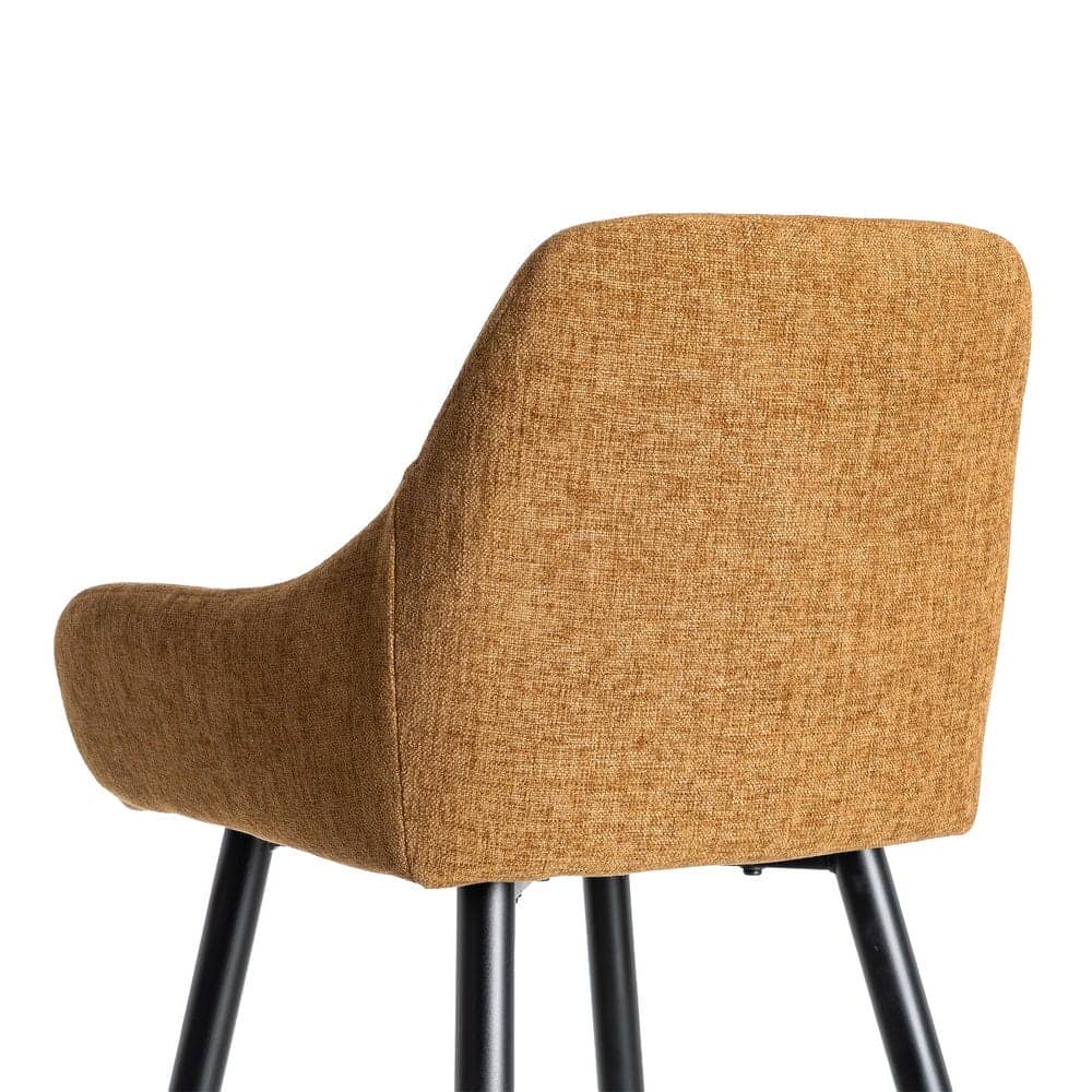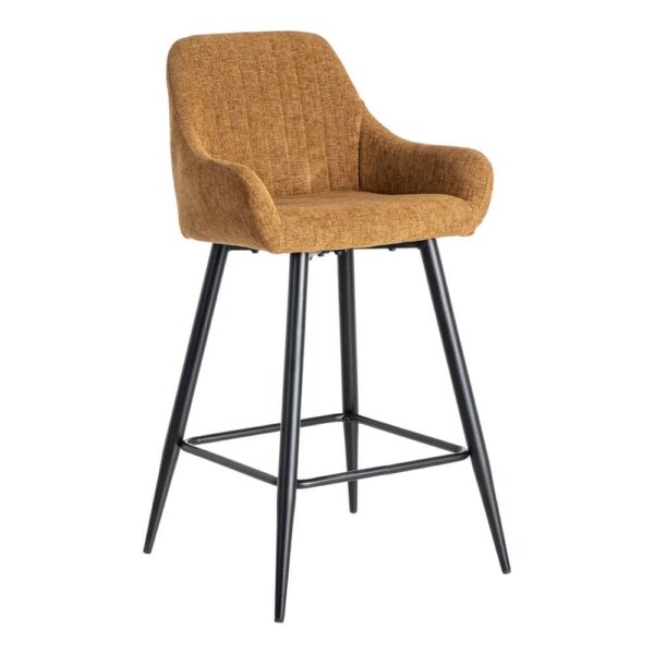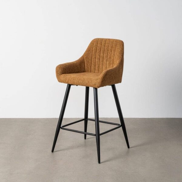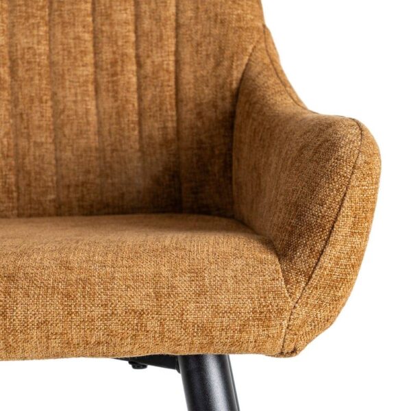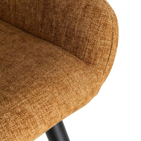 Material: tejido, metal. Altura asiento: 65cm. Ancho asiento: 36cm. Profundidad asiento: 35cm. Altura respaldo: 30cm. Altura reposabrazos: 10cm (75cm desde el suelo). No apilable. Cuample la normativa EN16139 (catering).