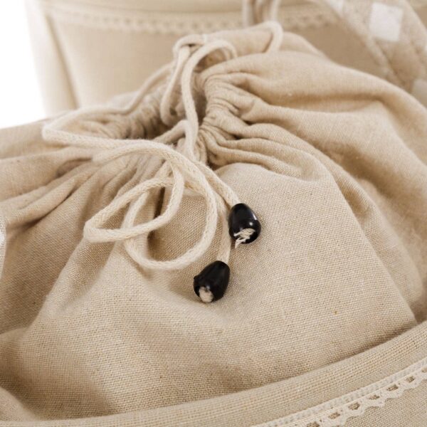 75807: 40X40X42 CM. CAPACIDAD: 53 L. 75808: 36X36X39 CM. CAPACIDAD: 40 L. 75809: 32X32X37 CM. CAPACIDAD: 30 L. 75810: 36X27X17 CM. 75811: 32X23X16 CM. 75812: 28X18X14 CM. 75813: 24X15X13 CM. TEJIDO EXTERIOR: 60% ALGODÓN – 40% POLIESTER. TEJIDO INTERIOR: 20% ALGODÓN – 80% POLIÉSTER.