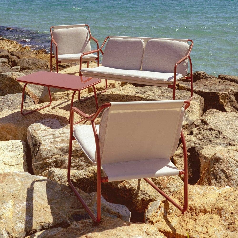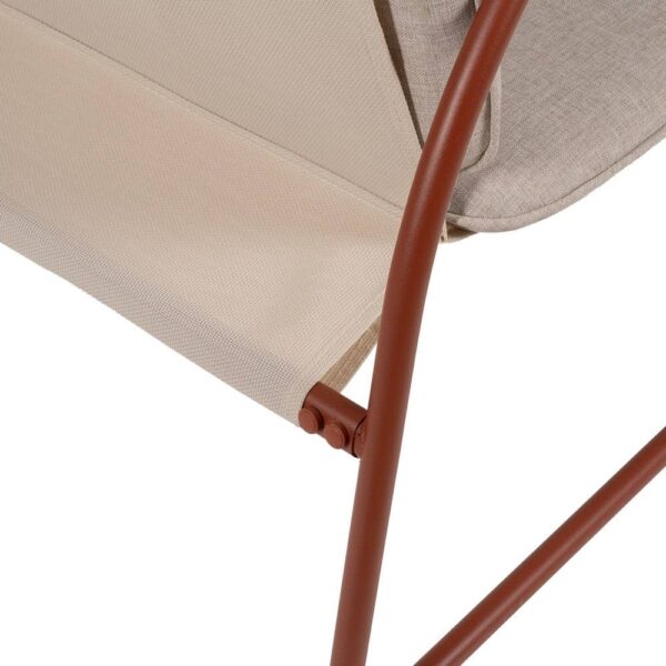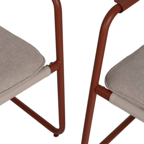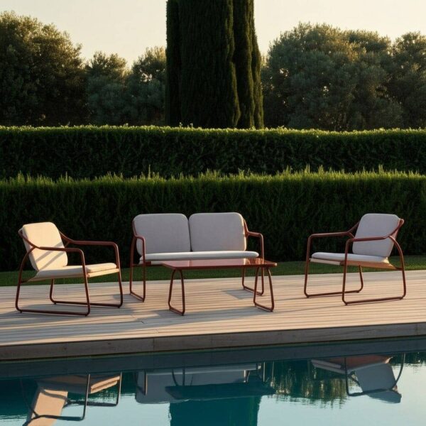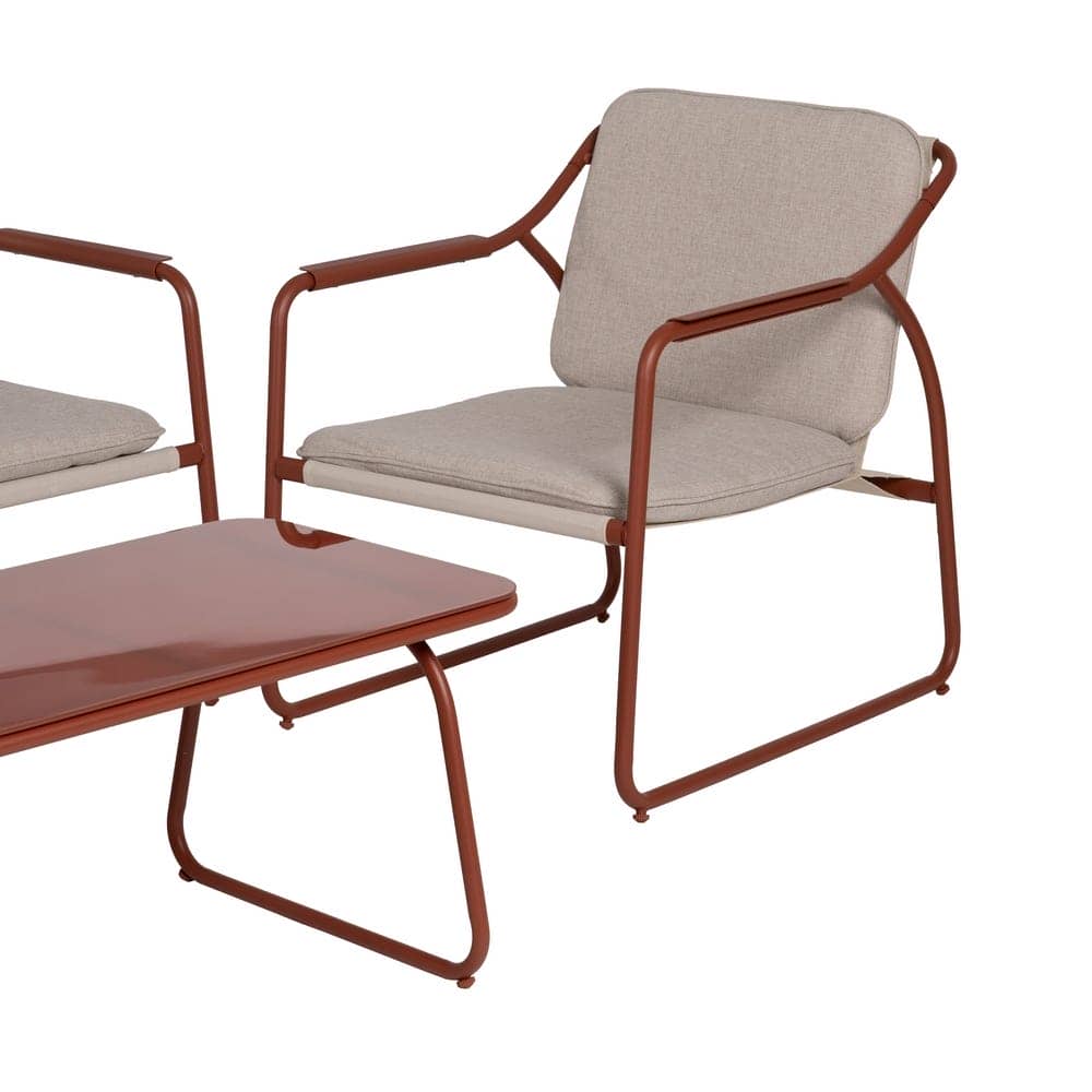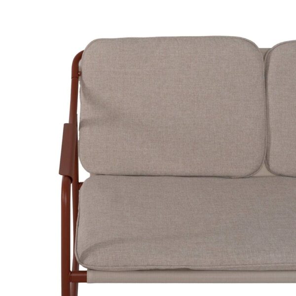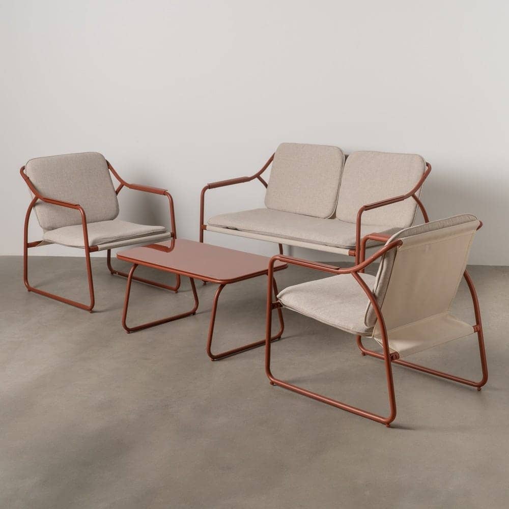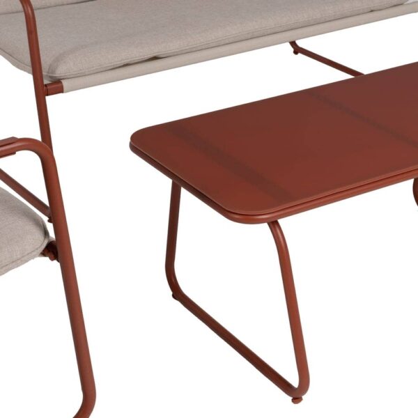 Incluye 1 sofá (118×72,5x75cm), 2 sillones (60×72,5x75cm) y 1 mesa de centro (85x45x41cm). Estructura de acero, tablero de la mesa de cristal templado. Base de los asientos de textileno (70% PVC, 30% poliéster). Tejido de los cojines 100% olefina. Relleno de 5cm de algodón + foam densidad 22 + algodón (3 capas). Altura asientos: 42cm. Ancho asiento: 110cm (sofá), 57cm (sillones). Profundidad asiento: 53cm. Altura respaldo: 41cm. Altura reposabrazos: 21cm. Cumple la normativa EN581 (uso exterior). Los muebles y productos de exterior son aptos para permanecer a la intemperie durante la temporada, sin embargo se recomienda colocarlos bajo techado o protegerlos de la lluvia, ya que el tejido no es a prueba de agua. Una vez acabada la temporada, se recomienda guardar o proteger adecuadamente para asegurar su mantenimiento.