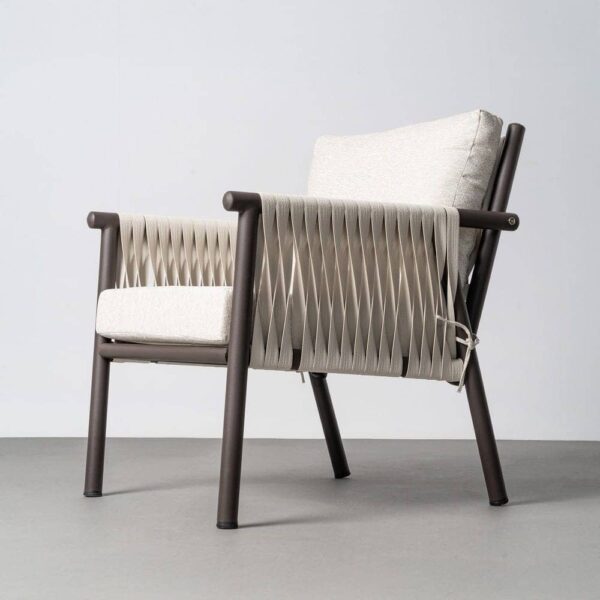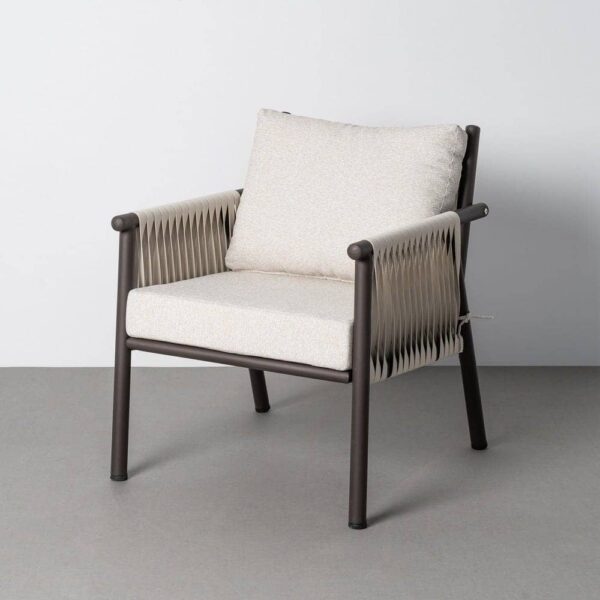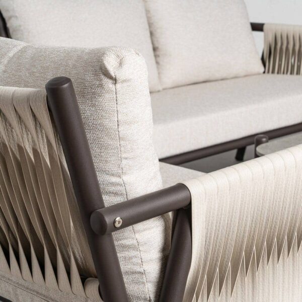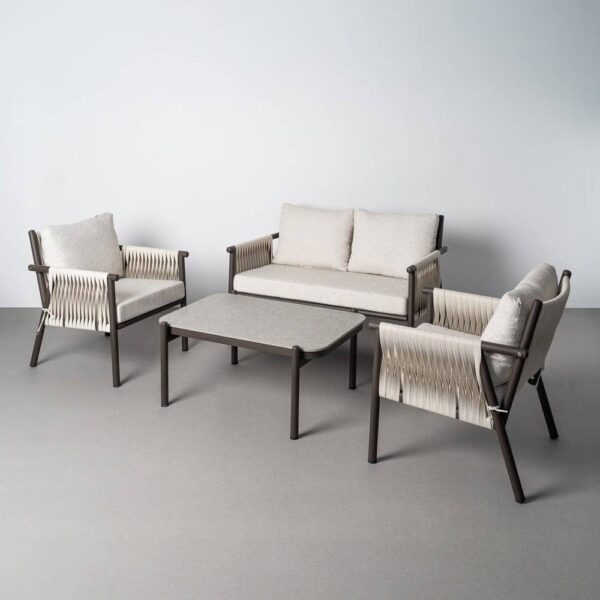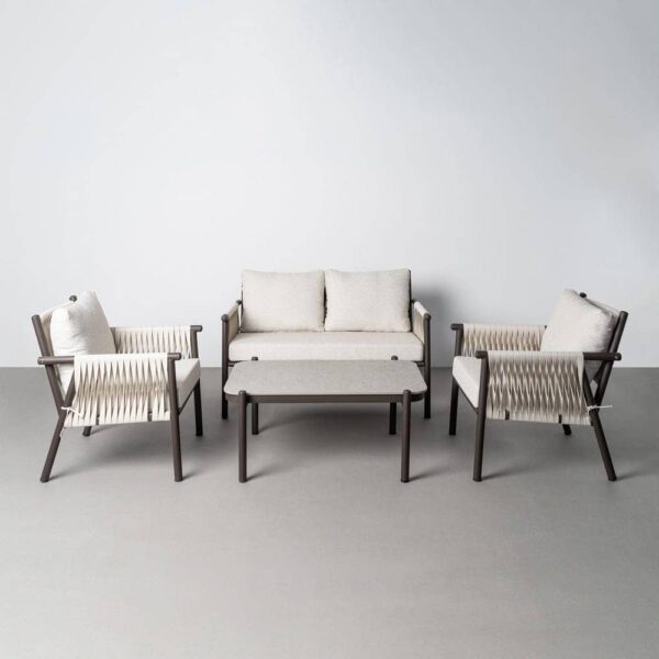 Incluye 1 sofá (126x77x77cm), 2 sillones (67x77x77cm) y 1 mesa centro (98x68x44cm). Estructura de acero y PE ratán. Tablero de la mesa de piedra sinterizada. Tejido 100% olefina. Relleno de foam y polifibra. Cojines desenfundables. Altura asiento: 45cm. Ancho asiento: 118cm (sofá)/58cm (sillones). Profundidad asiento: 47cm. Altura respaldo: 40cm. Altura reposabrazos: 19cm. Cumple la normativa EN581 (uso exterior). Los muebles y productos de exterior son aptos para permanecer a la intemperie durante la temporada, sin embargo se recomienda colocarlos bajo techado o protegerlos de la lluvia, ya que el tejido no es a prueba de agua. Una vez acabada la temporada, se recomienda guardar o proteger adecuadamente para asegurar su mantenimiento.