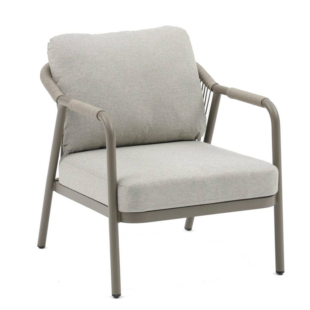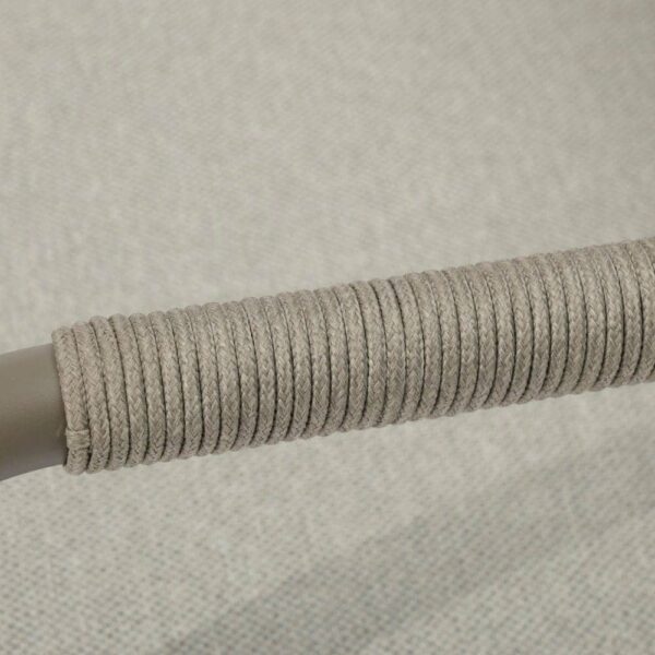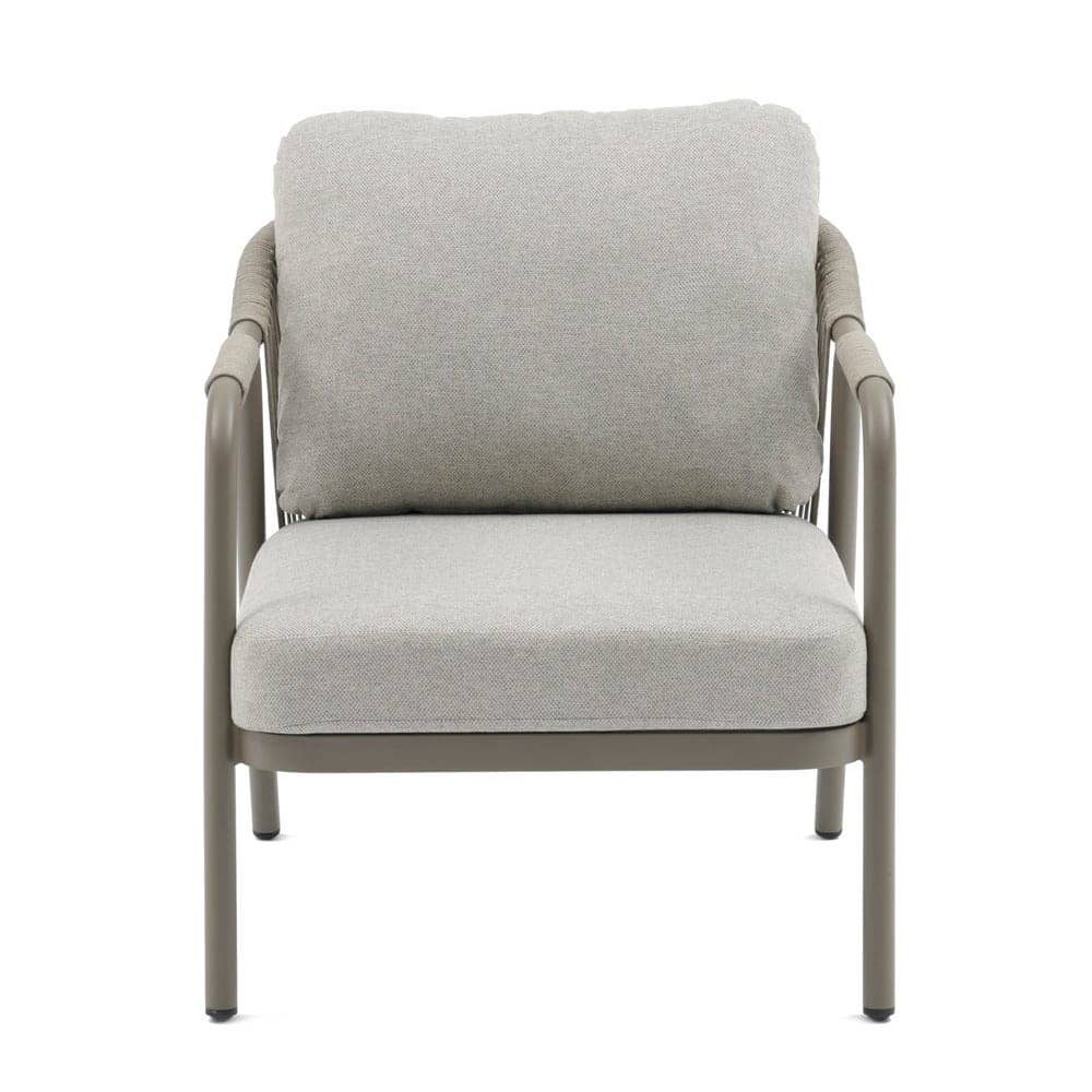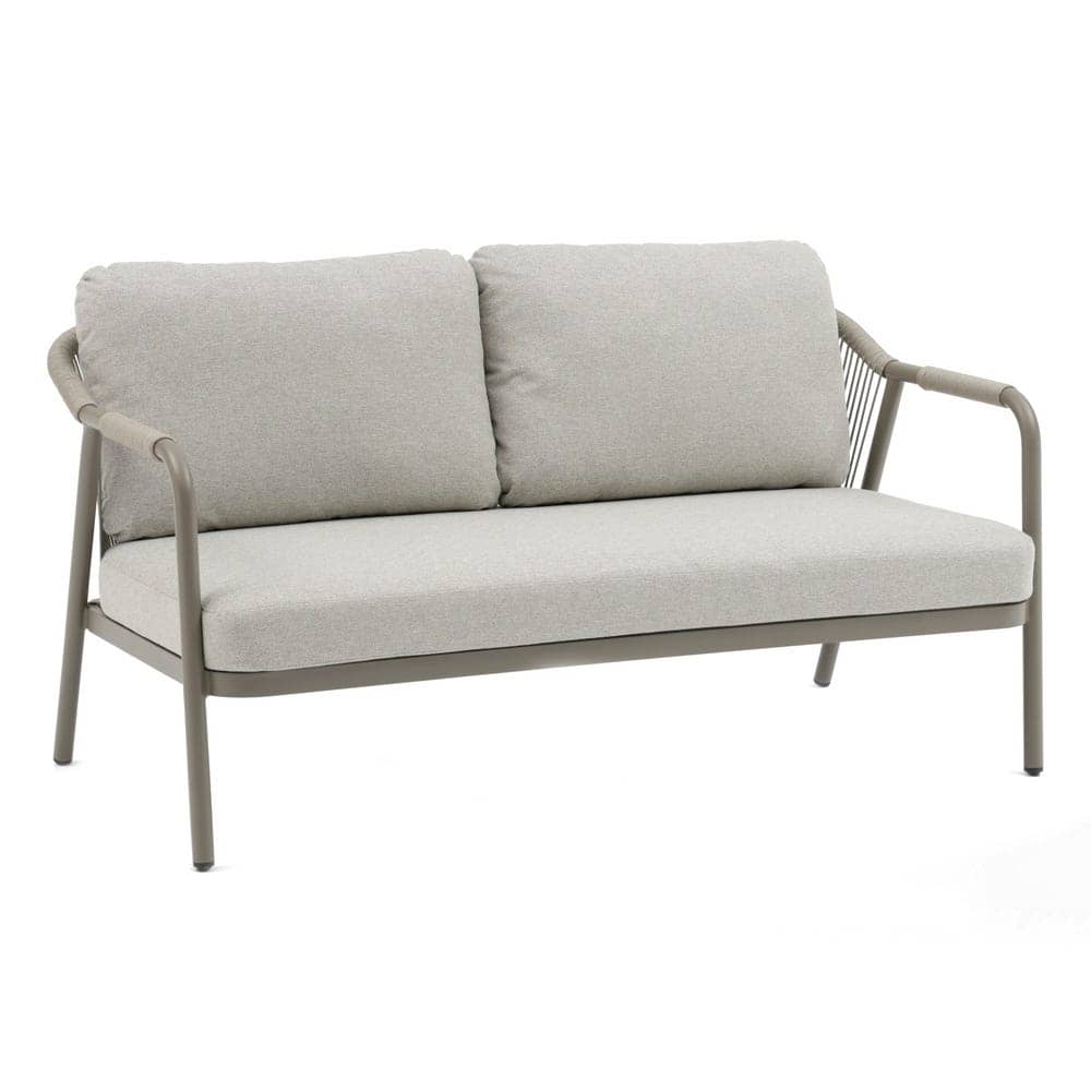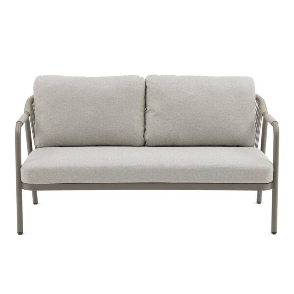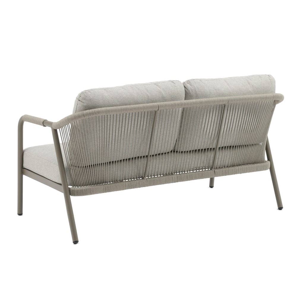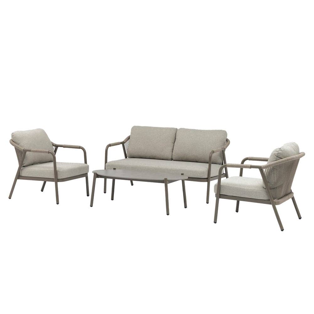 Compuesto de sofá de 2 plazas y dos sillones individuales.Respaldo y brazos decorados con cuerdas trenzadas. Mesa centro de 120x60cm en aluminio con sobre de porcelánico. Cojines de poliester. Un solo envase.