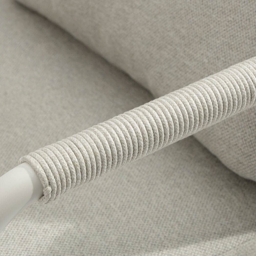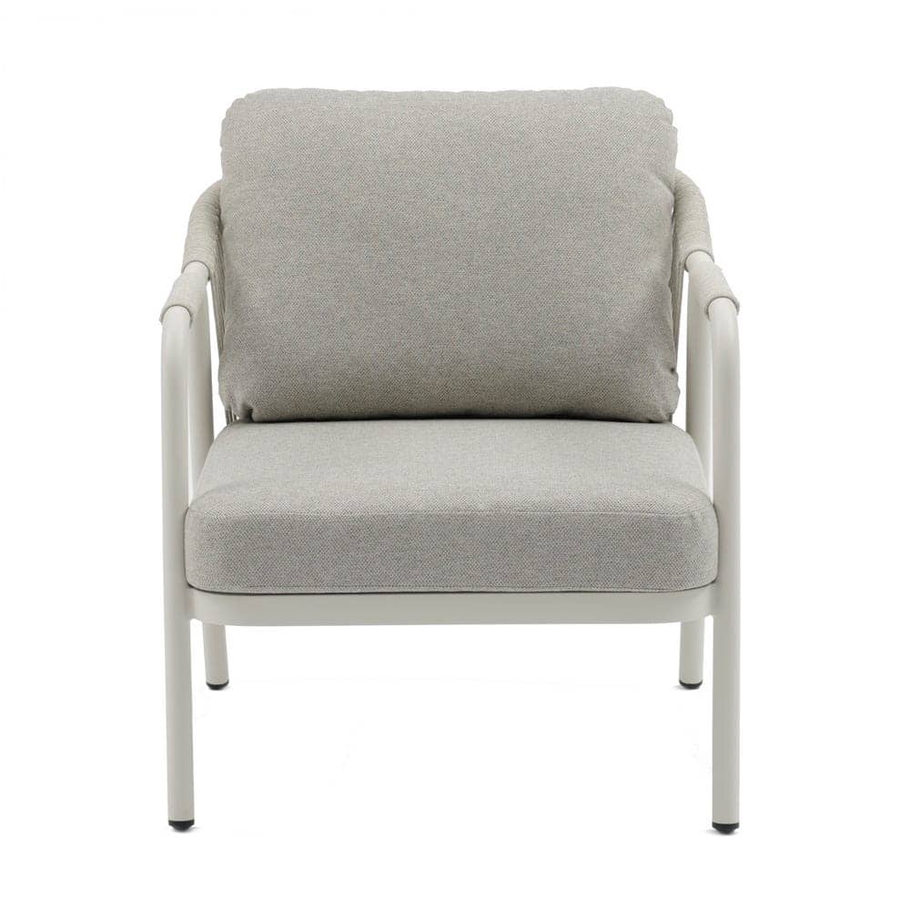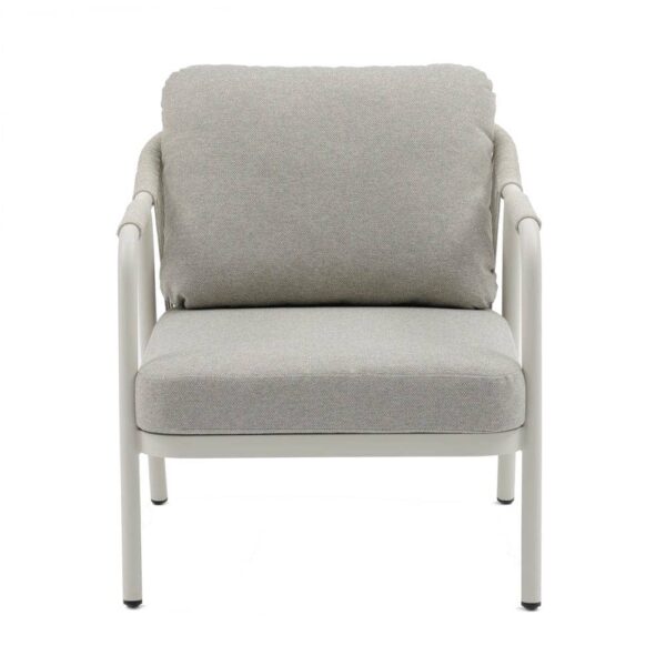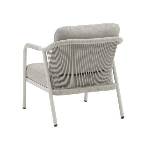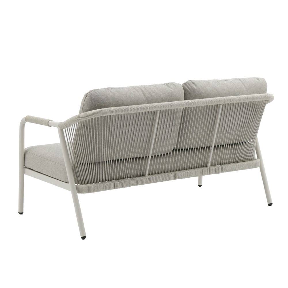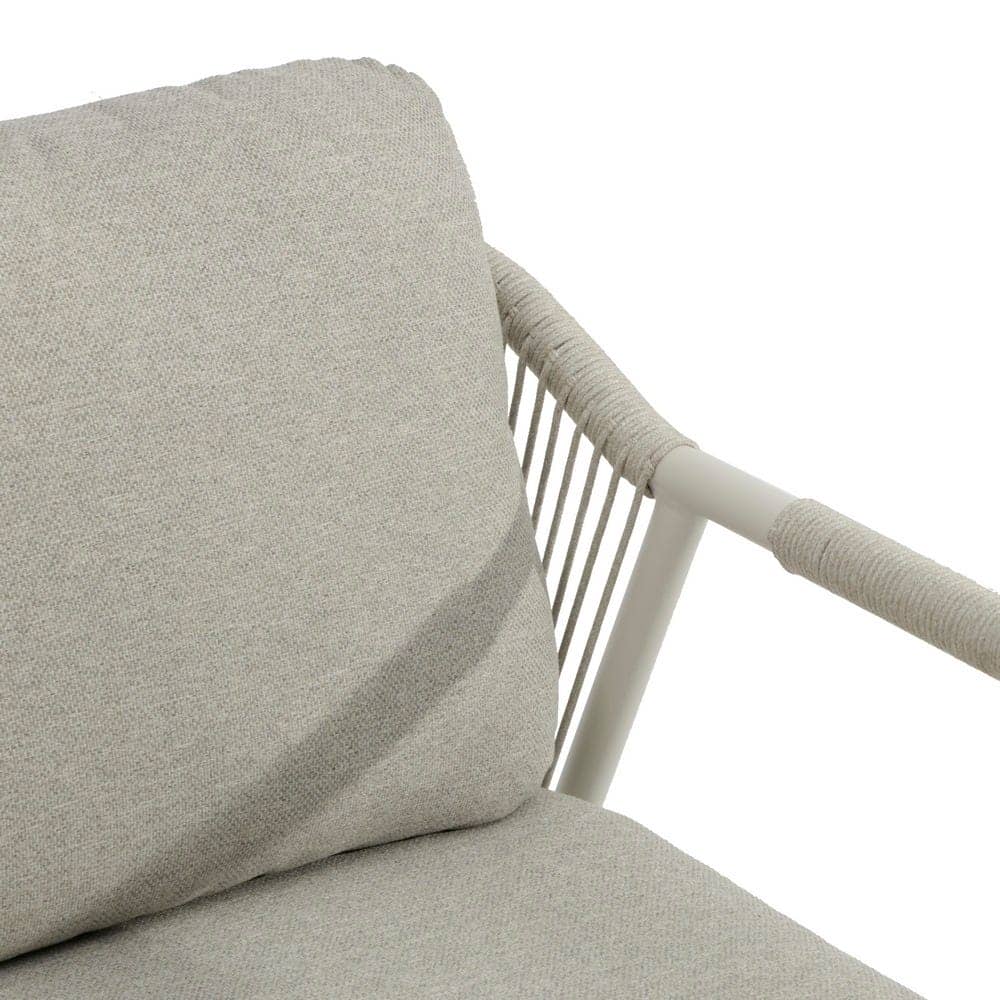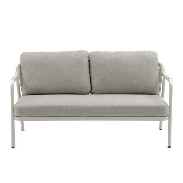 Compuesto de sofá de 2 plazas y dos sillones individuales.Respaldo y brazos decorados con cuerdas trenzadas. Mesa centro de 120x60cm en aluminio con sobre de porcelánico. Cojines de poliester. Un solo envase.