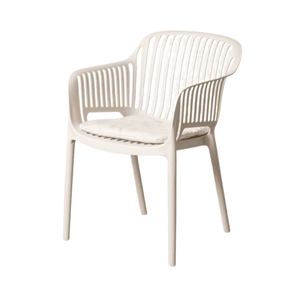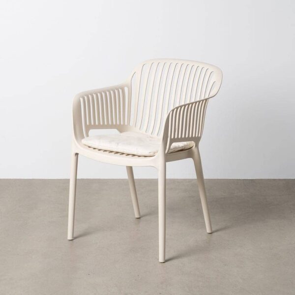 Material: polipropileno. Altura asiento: 45cm. Ancho asiento: 40cm. Profundidad asiento: 42cm. Altura respaldo: 40cm. Altura reposabrazos: 24cm (67cm desde el suelo). Cojín no desenfundable, tejido a prueba de agua. Cumple la normativa EN12520 (uso doméstico). Apilable.