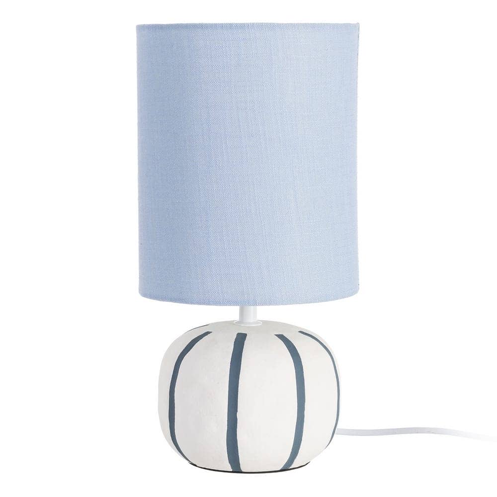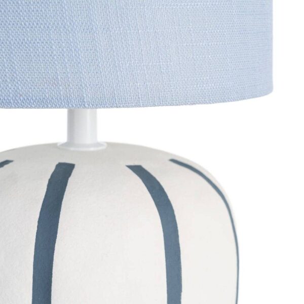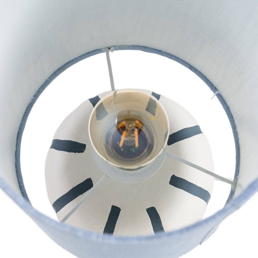 Base de cerámica, medidas 20,5×20,5×22,5cm. Pantalla de tejido y PVC, medidas 18x18x22cm. Voltios: 220-240V. Casquillo: E27. Bombilla: 1*60W máx(no incluida). Longitud cable: 125cm.