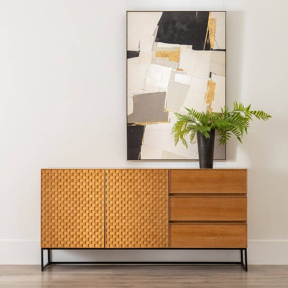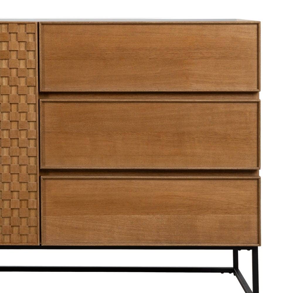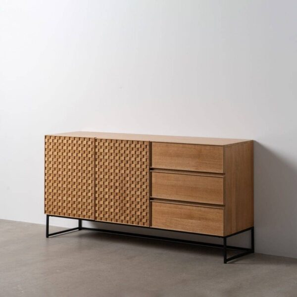 Material: Dm – metal (hierro) – vinilo madera de fresno. Medida puertas: 49x61cm. Medida cajones: 60.5x19cm. Altura pata: 18cm. Leja interior, altura huecos: 27.5cm. Patas para montar.