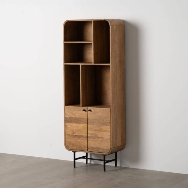 Material: madera de mango, hierro. Puertas: 28,5×46,5cm. Altura huecos: 45cm/21,5cm. Altura patas: 19cm. 1 leja interior a mitad de altura.