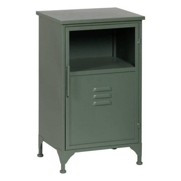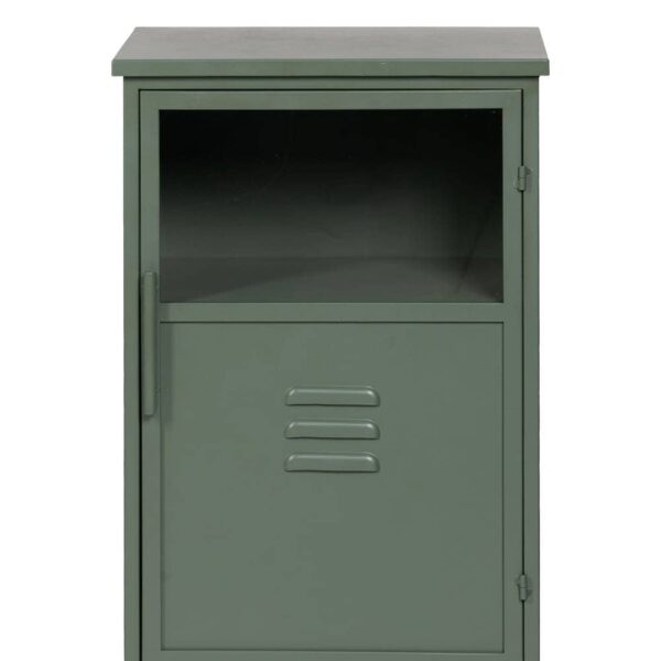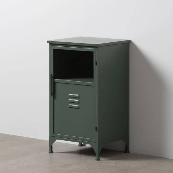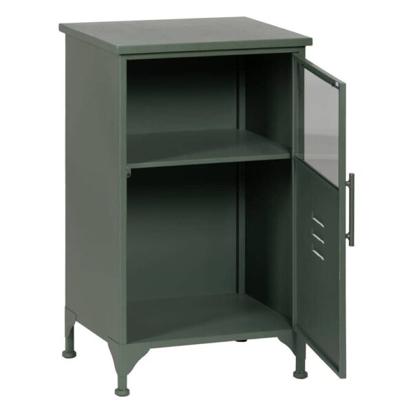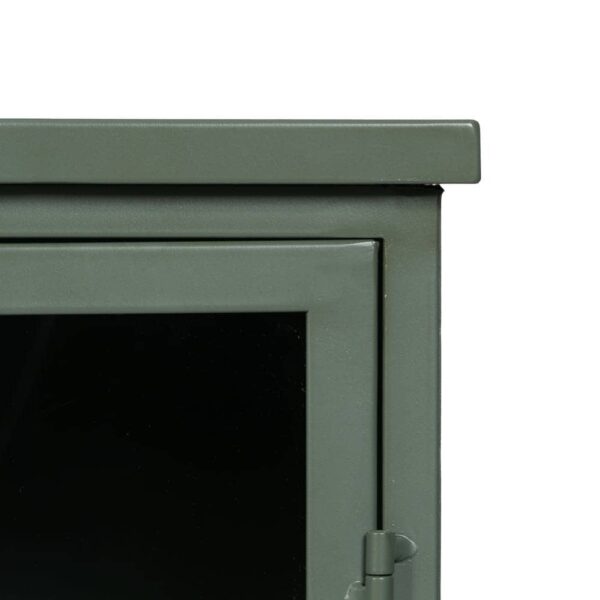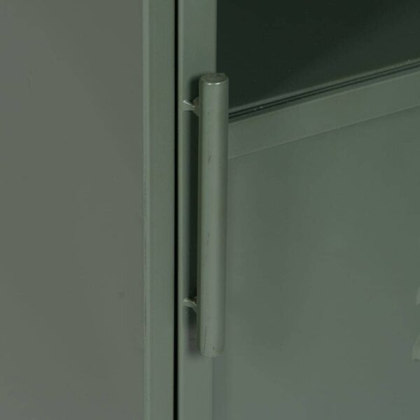 Material: hierro – cristal. Altura patas: 9.5cm. Medida puerta: 39.5x61cm. 1 leja, altura huecos leja: 22.5 – 37.5cm.