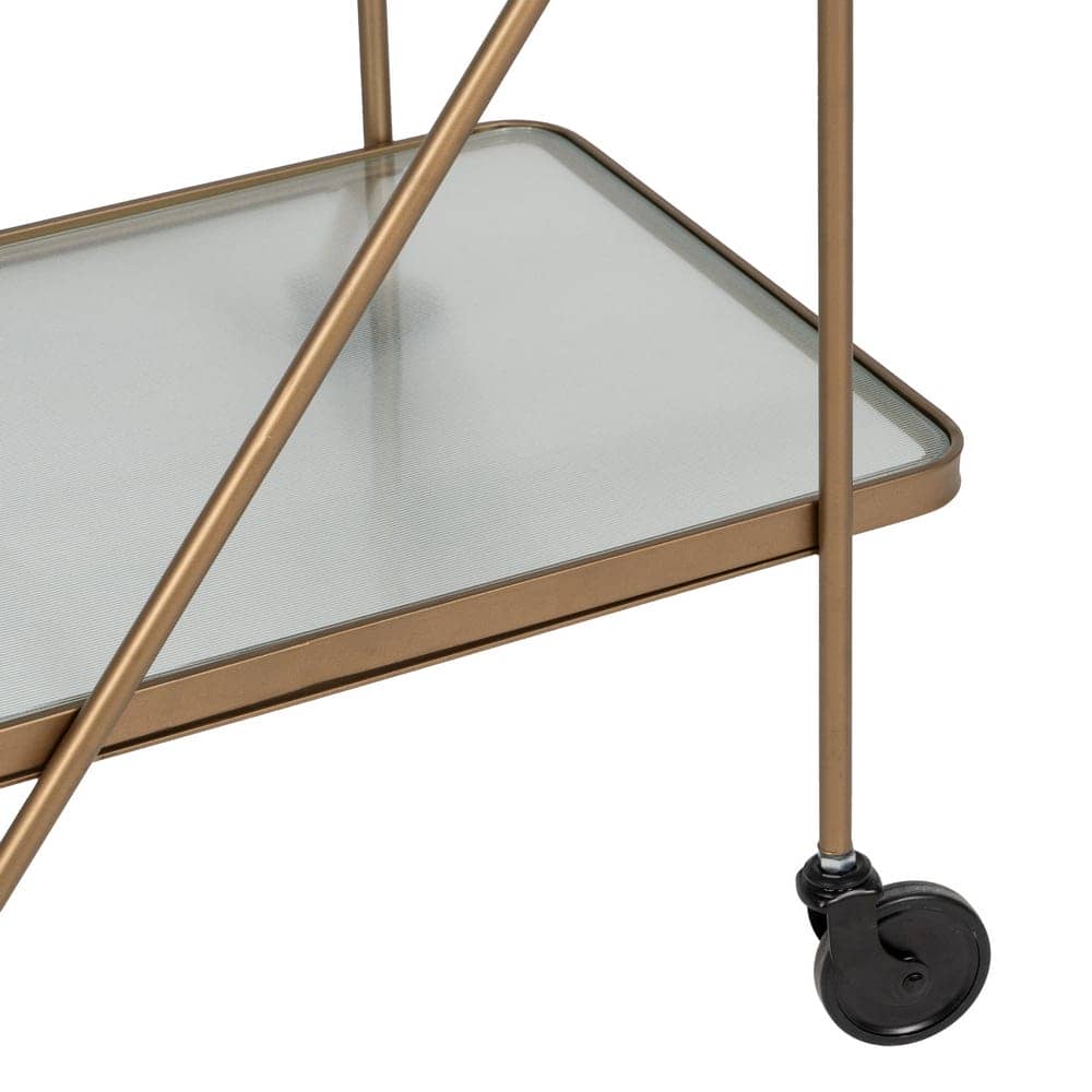 Con unas dimensiones de 61 cm x 40 cm x 70 cm y bandejas de 60×36 cm, ofrece una capacidad perfecta para mantener tus objetos organizados y a mano. La altura entre bandejas de 32,5 cm proporciona suficiente espacio para almacenar tus artículos, mientras que las patas para montar aseguran estabilidad y resistencia. Hecha de hierro y cristal, su estructura metálica dorada no solo es resistente, sino que también agrega un toque de lujo a tu hogar o negocio.