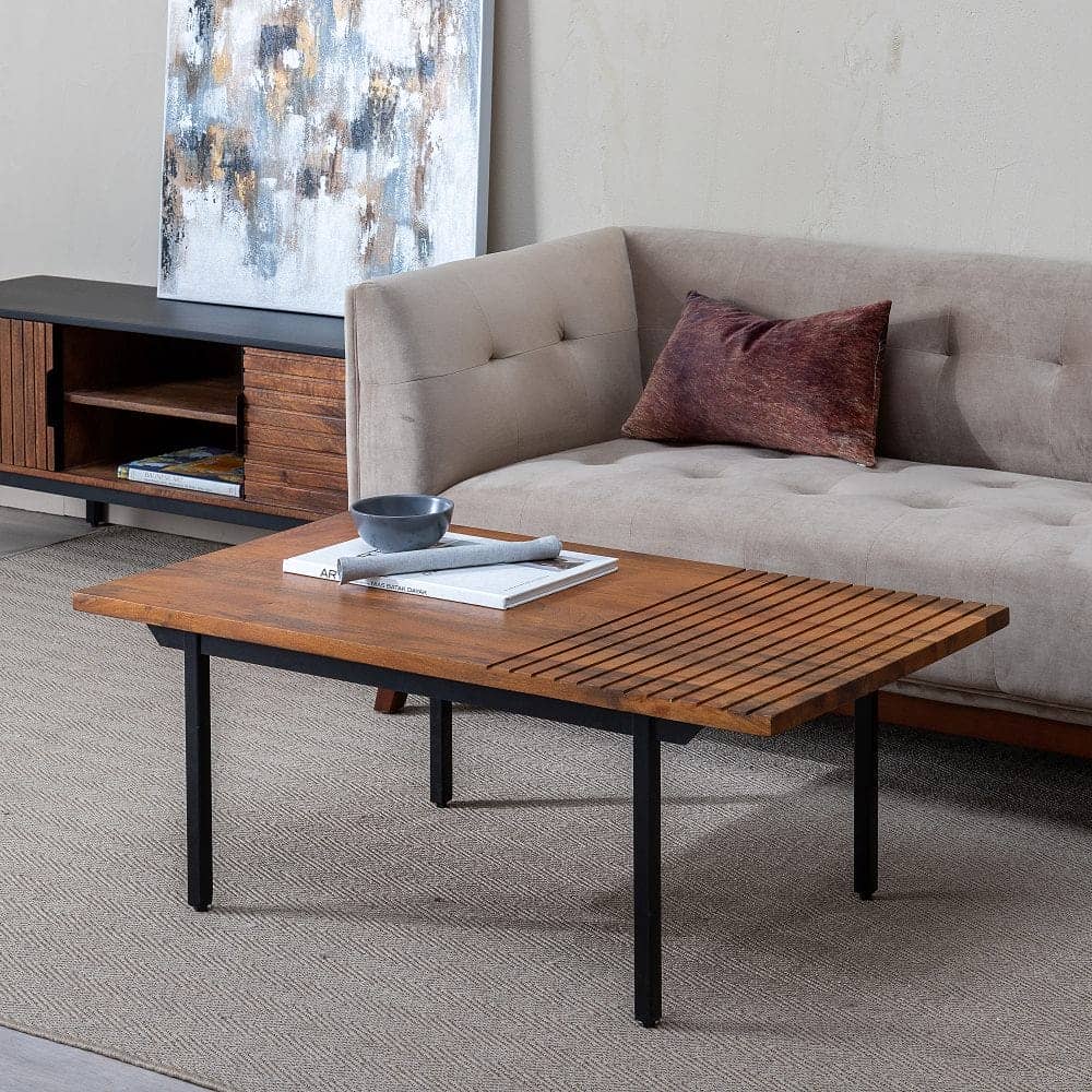 Una combinación perfecta de madera de mango y hierro que aporta carácter y estilo a tu salón. Esta mesa de centro destaca por su diseño contemporáneo y funcional, ideal para ambientes modernos o industriales. Su robusta estructura y acabado en marrón y negro reflejan una estética sofisticada y duradera.