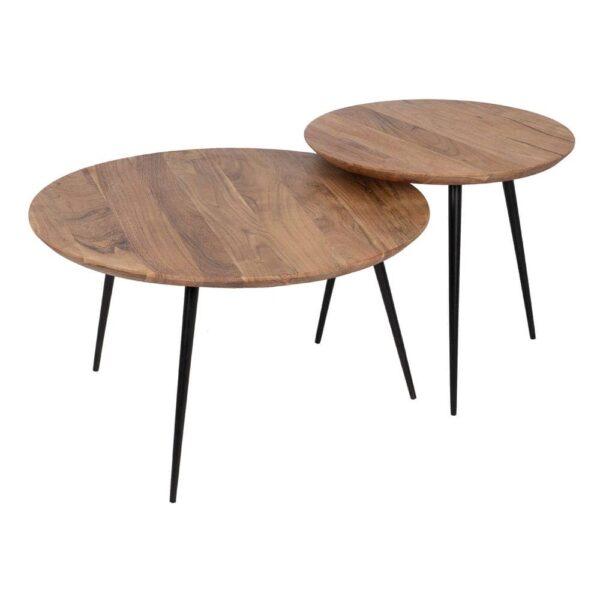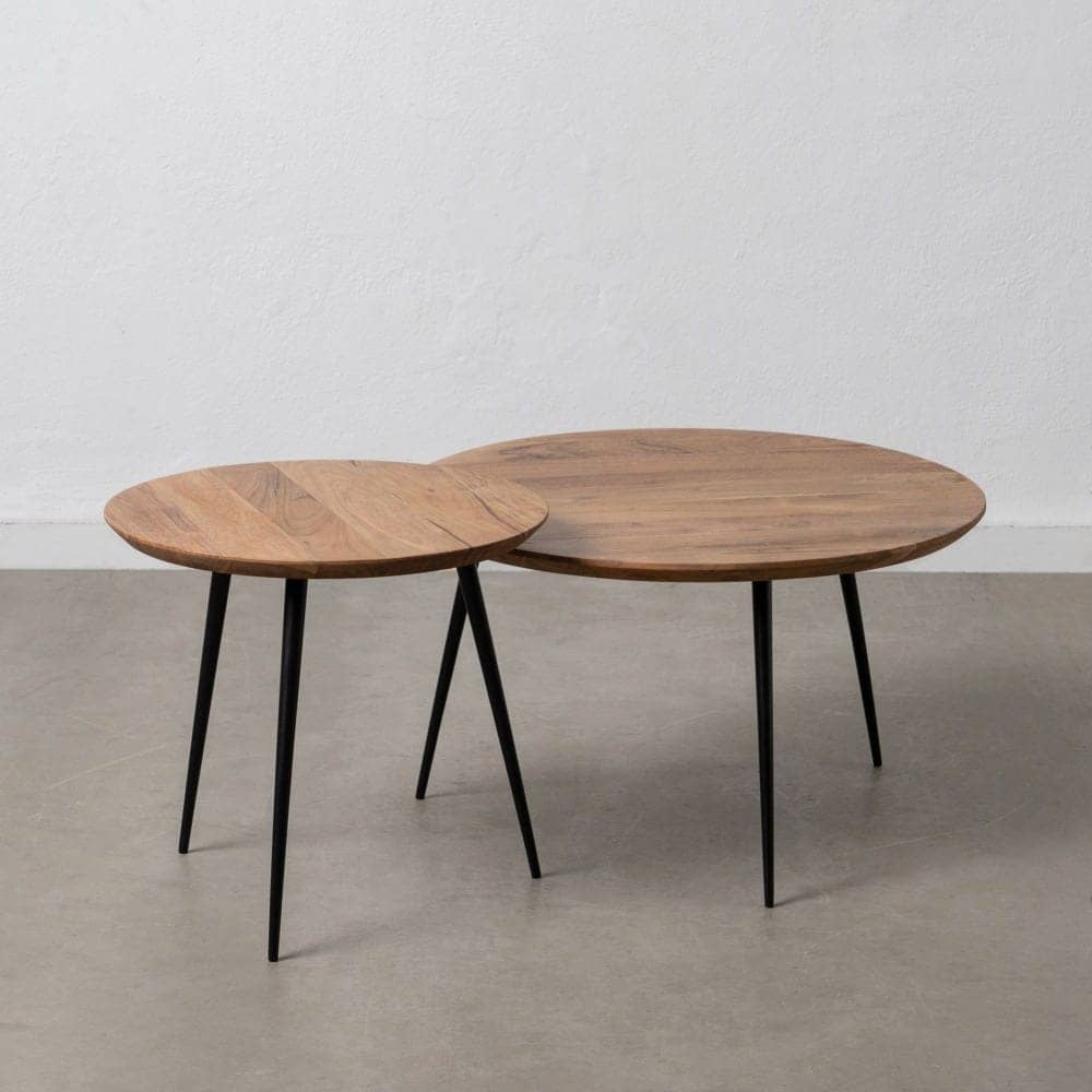 El Set de 2 Mesas Centro Natural es la combinación perfecta de elegancia y funcionalidad para tu salón. Con una estructura de madera de acacia de acabado natural y patas de hierro, estas mesas son una declaración de estilo rústico y moderno al mismo tiempo. El set incluye dos mesas con medidas de 70x70x40 cm y 50x50x45 cm, lo que te permite adaptarlas a cualquier espacio o usarlas por separado para un toque de flexibilidad en la decoración. La madera maciza aporta un encanto rústico mientras que las patas de hierro ofrecen un diseño industrial, garantizando durabilidad y estabilidad.