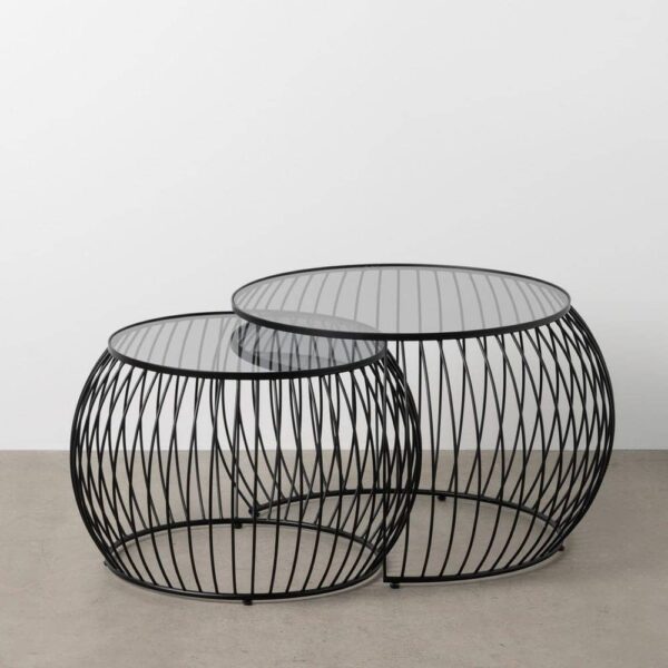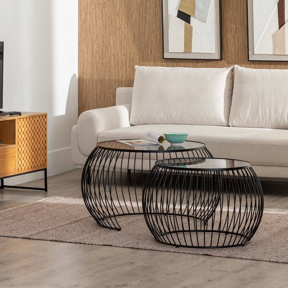 El Set de 2 Mesas de Centro de Metal y Cristal destaca por su diseño sofisticado y versátil. Fabricadas en hierro negro con superficies de cristal, estas mesas ofrecen una estética ligera pero robusta, ideal para salones modernos o minimalistas. La mesa grande, con medidas de 89 cm x 80 cm x 51 cm, y la pequeña, de 70 cm x 70 cm x 46 cm, se complementan perfectamente, permitiendo múltiples configuraciones y adaptándose a cualquier espacio. Su estructura geométrica aporta un toque decorativo único, mientras que su peso de 14 kg asegura estabilidad. Al no requerir montaje, son perfectas para disfrutar desde el primer momento. Añade un toque de diseño exclusivo a tu hogar con este conjunto imprescindible.
