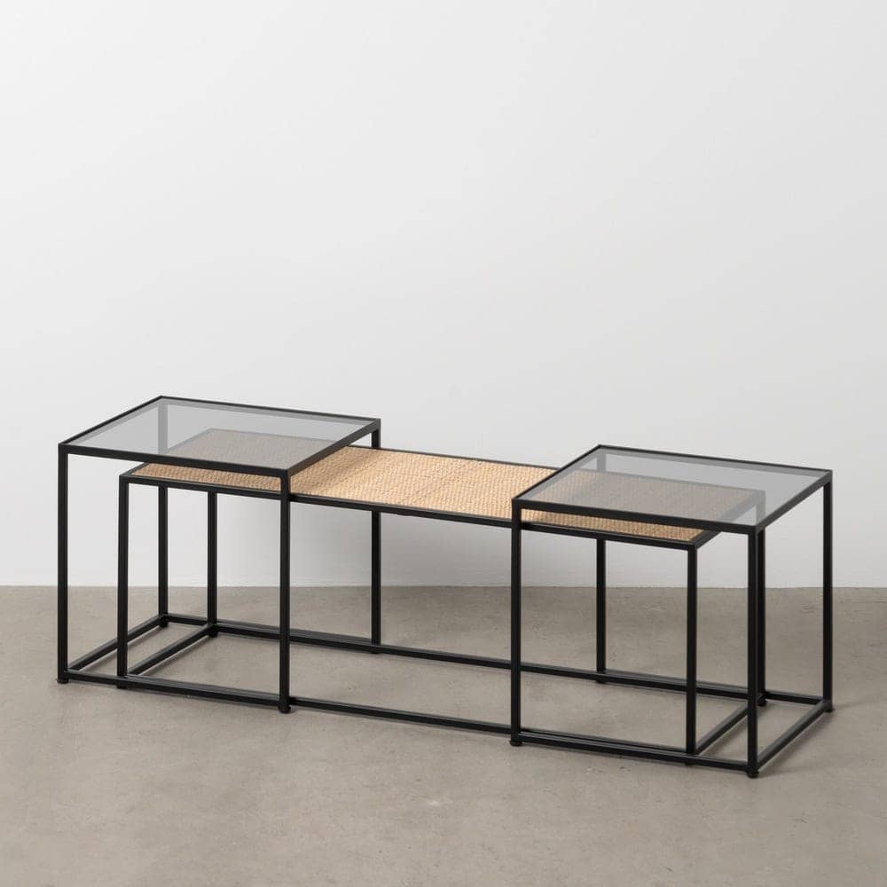 El Set de 3 Mesas de Centro Natural y Negro es la solución perfecta para quienes buscan funcionalidad sin renunciar al diseño. Compuesto por una mesa grande (97,5 cm x 34 cm x 34,5 cm) y dos auxiliares (40 cm x 38 cm x 39 cm), este conjunto destaca por su combinación de materiales: una estructura de hierro negro, detalles en ratán natural y superficies de cristal. Su diseño modular permite múltiples configuraciones, adaptándose a salones modernos, bohemios o industriales. Además, con un peso total de 11,5 kg, ofrecen estabilidad y ligereza visual. Al no requerir montaje, estas mesas están listas para transformar tu hogar desde el primer momento. Aporta estilo y funcionalidad a tu espacio con este set exclusivo.
