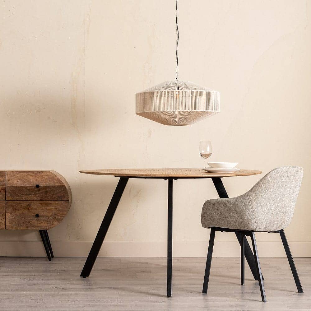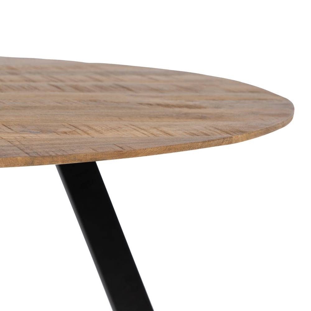 Impresiona a tus invitados con esta elegante mesa redonda de 130 cm, donde el cálido tono natural de la madera de mango se combina con el contraste moderno de sus patas negras de hierro. Ideal para crear espacios únicos con estilo contemporáneo.