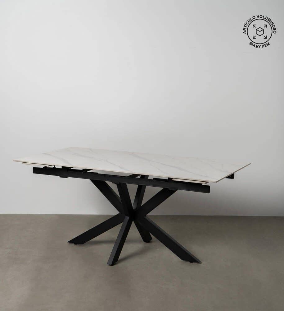 Mesa Extensible Blanco-Negro con Top Cerámico Imitación Mármol – 76 cm, Diseño Moderno y Elegante para Comedores, Hasta 220 cm de Largo, Patas de Metal Negro, Fácil Montaje