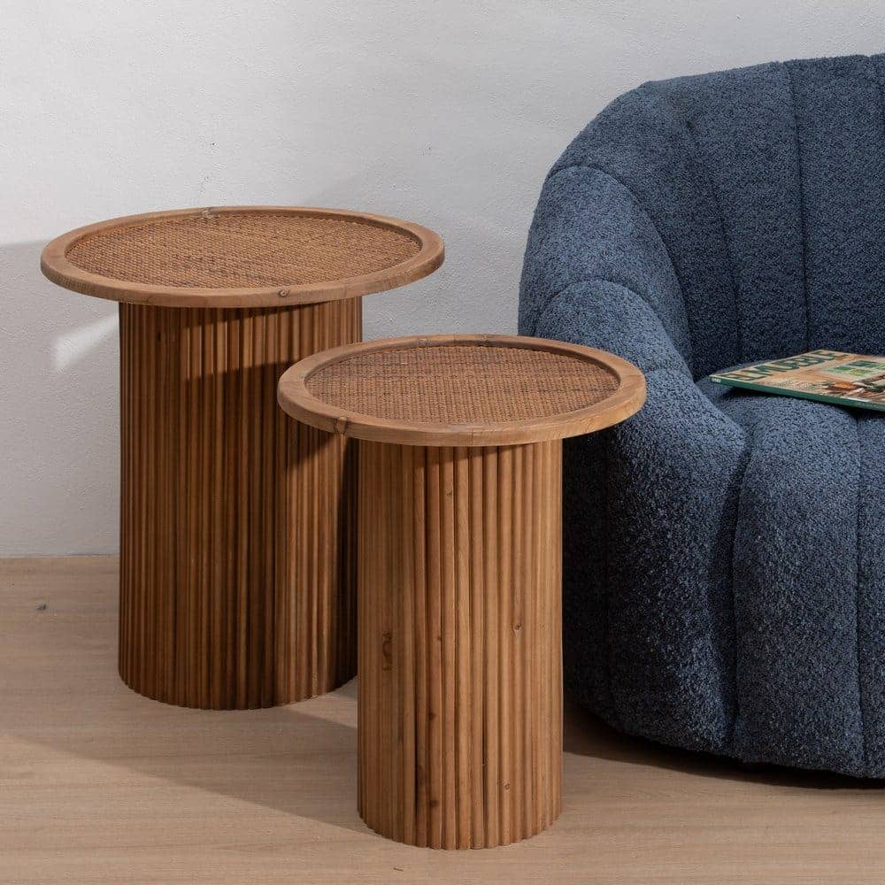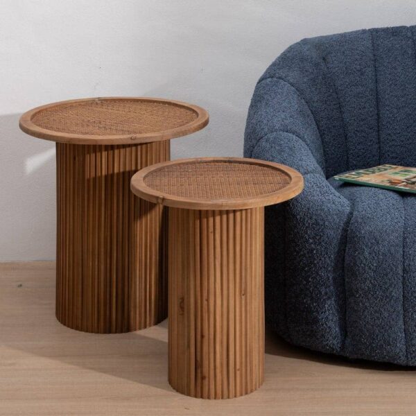 Con unas dimensiones de 49,5 x 49,5 x 50 cm, esta mesita está fabricada con madera natural y detalles en ratán trenzado que aportan textura y encanto. Su base acanalada y su sobre delicadamente trabajado ofrecen un diseño único y sofisticado. Perfecta para espacios modernos, bohemios o rústicos, no precisa montaje, lo que permite disfrutarla al instante. Ya sea como mesa auxiliar, soporte decorativo o pieza funcional, esta mesita aporta un toque cálido y atemporal a tu hogar. Eleva el estilo de tu salón con esta pieza llena de personalidad y versatilidad.