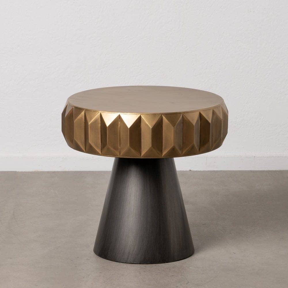 Con unas medidas de 63 x 63 x 62 cm, esta mesita está fabricada en hierro, lo que garantiza su resistencia y durabilidad. Su base cónica en negro contrasta de manera armoniosa con el sobre dorado decorado con patrones geométricos, creando un diseño llamativo y exclusivo. Perfecta para salones, recibidores o incluso como mesa auxiliar en espacios destacados, no precisa montaje, lo que permite disfrutarla de inmediato. Este mueble combina funcionalidad y diseño para aportar un toque de lujo a tu decoración. Haz de esta mesita el centro de atención de tu hogar.