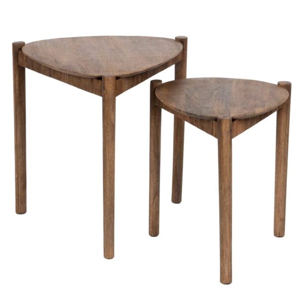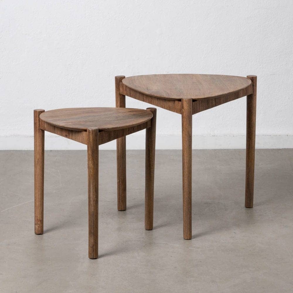 Este set incluye dos mesas de diferentes tamaños (58 x 56 x 56 cm y 47 x 44 x 49 cm), fabricadas con madera de mango, un material resistente y duradero que destaca por sus tonalidades cálidas y vetas naturales. Su diseño apilable y práctico las hace ideales para espacios pequeños, permitiendo ahorrar espacio sin sacrificar estilo. Perfectas para complementar salones, dormitorios o incluso como apoyo en entradas o terrazas cubiertas, estas mesas se integran con facilidad en decoraciones rústicas, nórdicas o contemporáneas. Aporta un toque de autenticidad y funcionalidad a tu hogar con este set de mesas auxiliares únicas. Hazlas tuyas y disfruta de un hogar con personalidad.