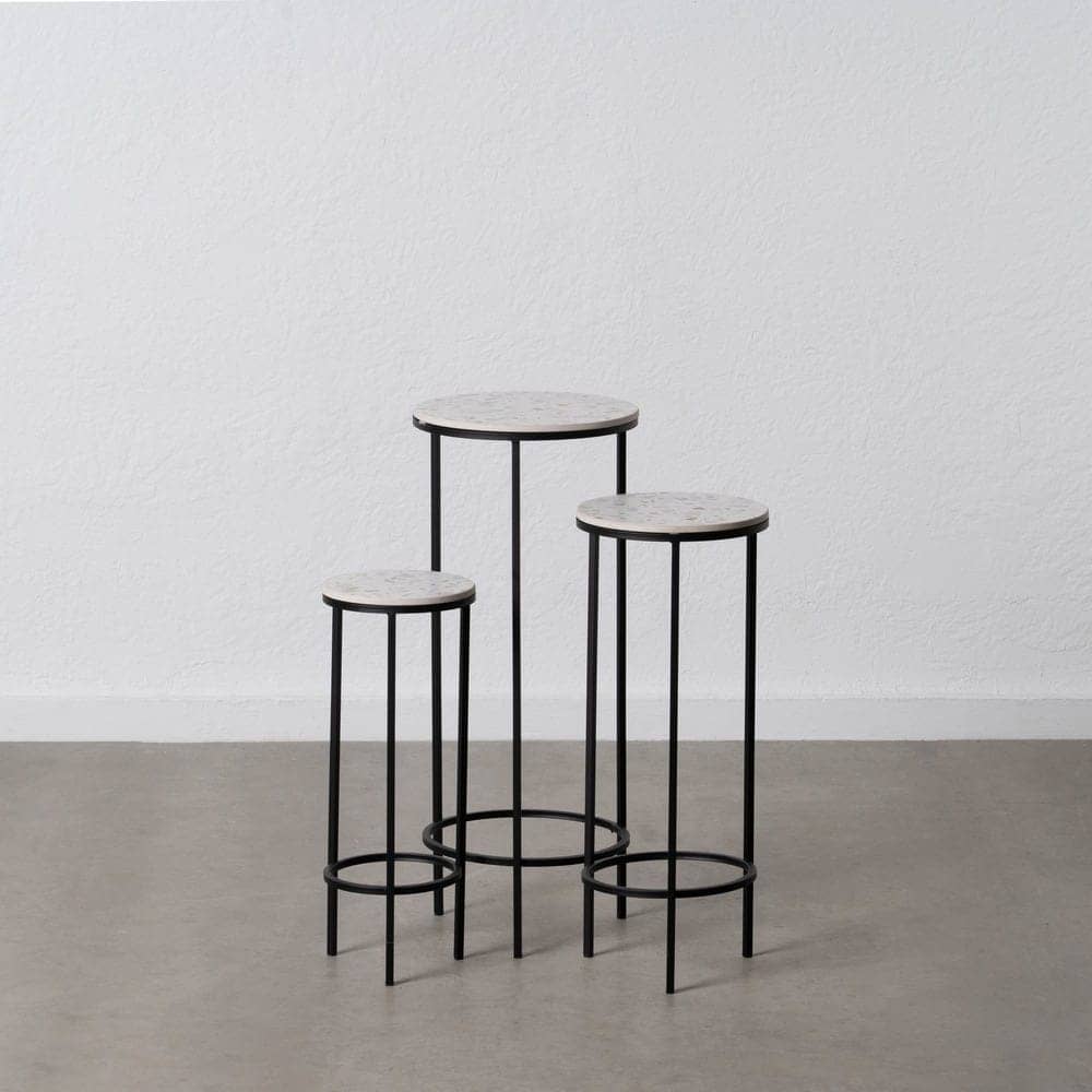 Eleva la sofisticación de tu espacio con este set de 3 mesitas en hierro, acabado en elegante gris y negro. Perfectas para añadir un toque contemporáneo y funcionalidad a tu hogar.