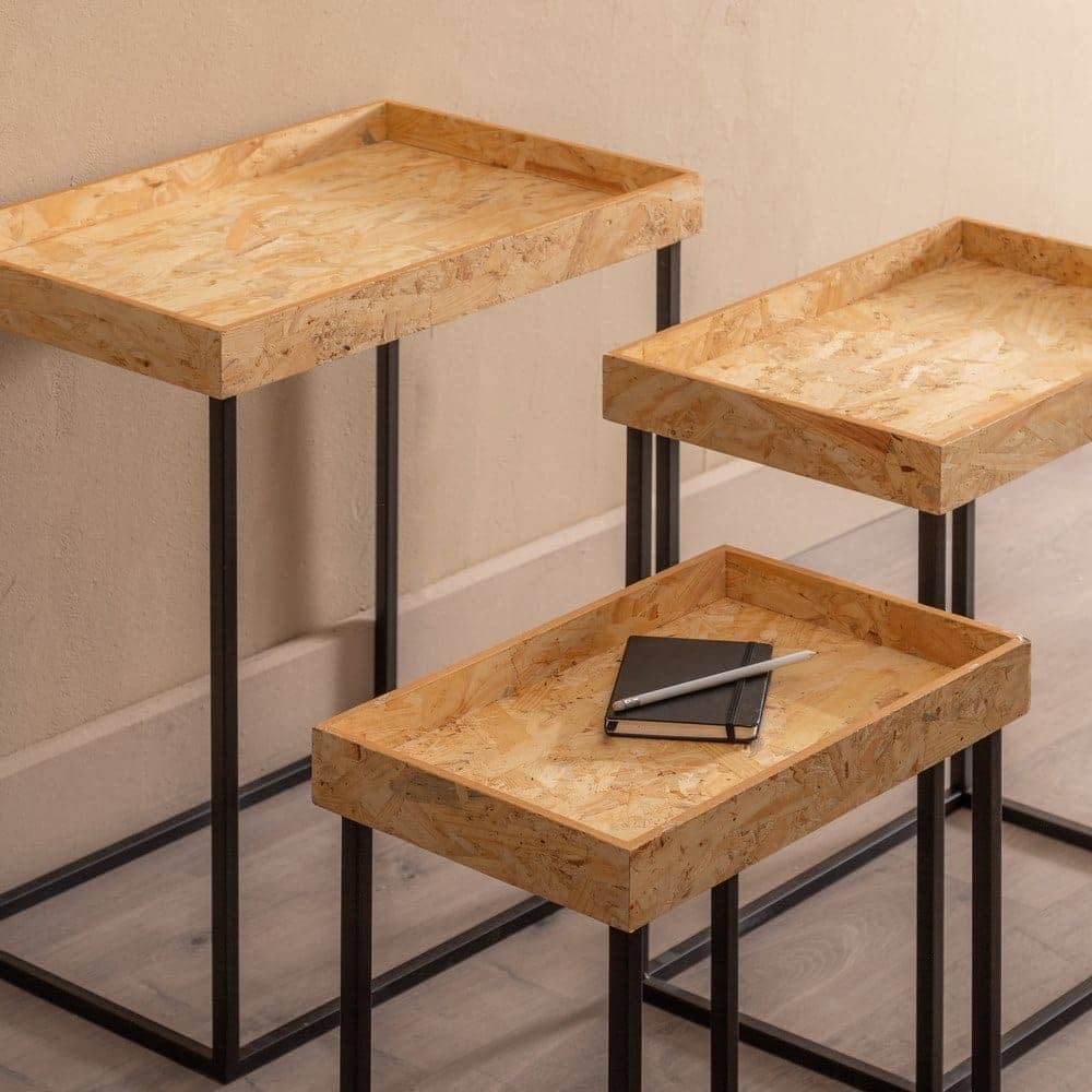 Fabricadas con una estructura de hierro y sobres en fibra de madera, estas mesitas combinan ligereza y durabilidad. Sus medidas (grande: 57,5 x 37,5 x 67,5 cm, mediana: 50,5 x 33 x 59 cm, pequeña: 44 x 27,5 x 51 cm) las hacen perfectas para espacios versátiles, pudiendo usarse como mesas auxiliares o decorativas. Su diseño apilable permite ahorrar espacio cuando no se están utilizando, y su montaje sencillo facilita su integración en cualquier hogar. El contraste entre el acabado natural de la madera y el negro industrial del metal añade un toque moderno a cualquier estancia. Dale a tu salón un aire fresco y contemporáneo con este set imprescindible.