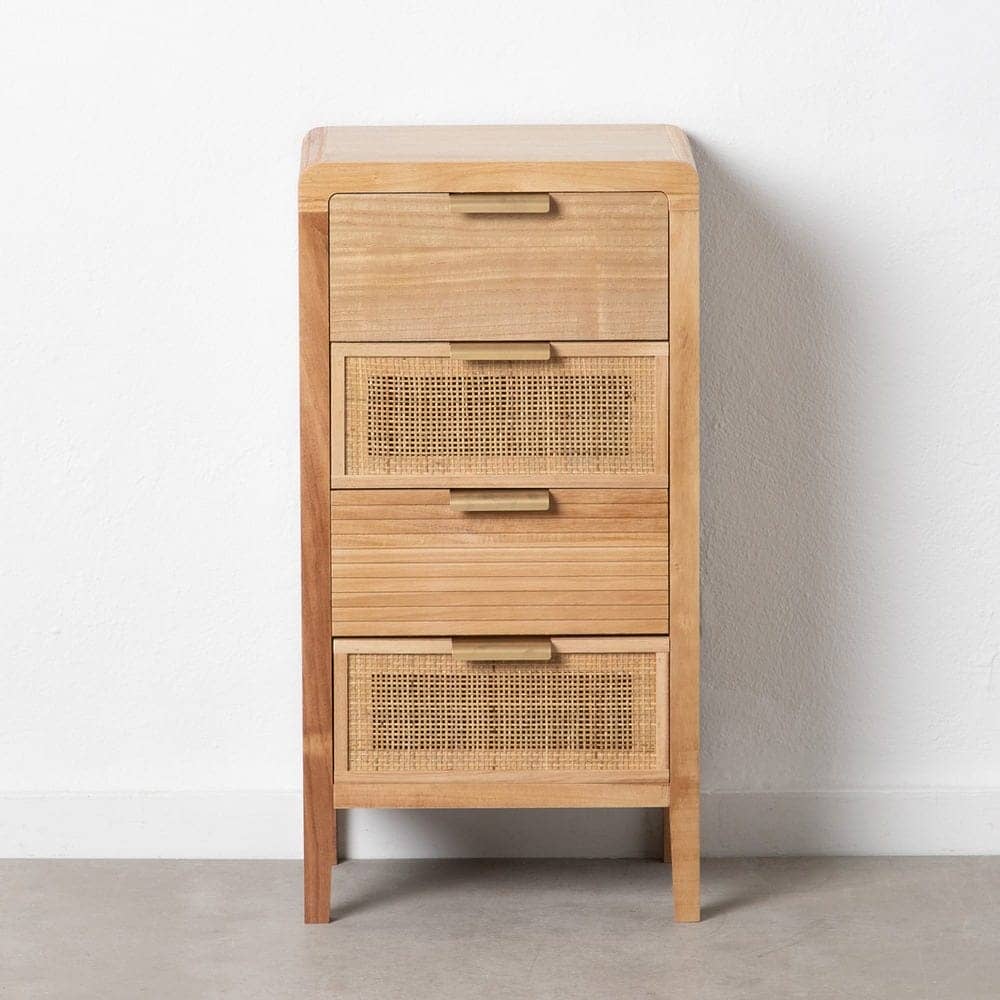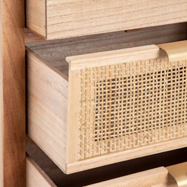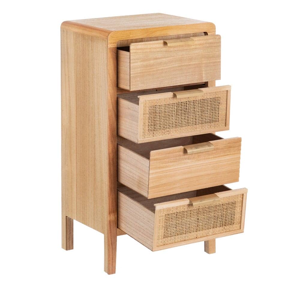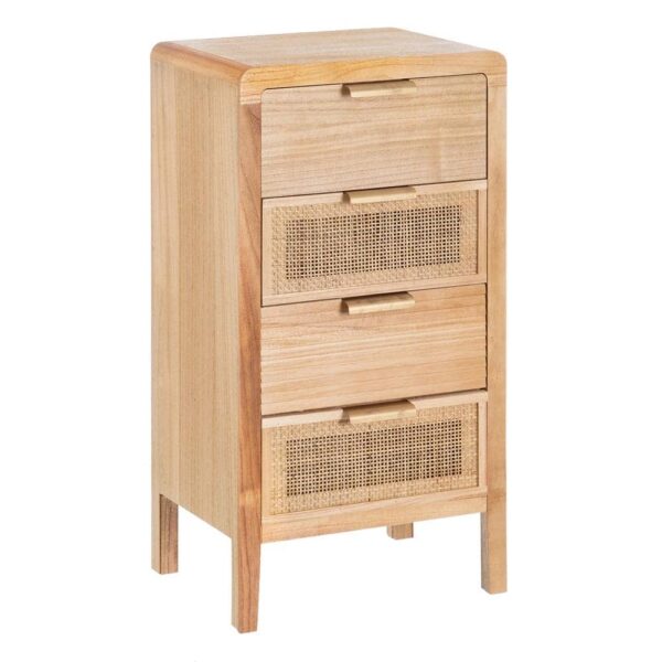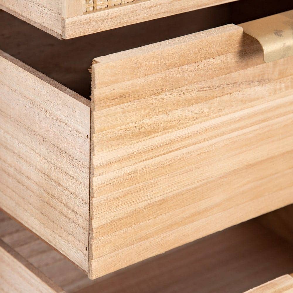 La mesita Natural Madera-Ratán es una pieza destacada de la colección *Honey*, fabricada en madera de paulonia y ratán, lo que le confiere un diseño robusto y cálido, ideal para cualquier dormitorio. Con unas medidas de 40 cm x 30 cm x 77,5 cm, cuenta con dos cajones de 34×15 cm perfectos para mantener tus objetos organizados. La altura de las patas de 12 cm aporta ligereza y un toque de elegancia. Además, su diseño no requiere montaje, lo que facilita su colocación en tu hogar. Su color natural complementa cualquier estilo, desde el rústico hasta el moderno. Con un peso de 8 kg, esta mesita es una opción práctica y sofisticada para tu habitación. ¡Descubre la calidad y el estilo con esta pieza única!