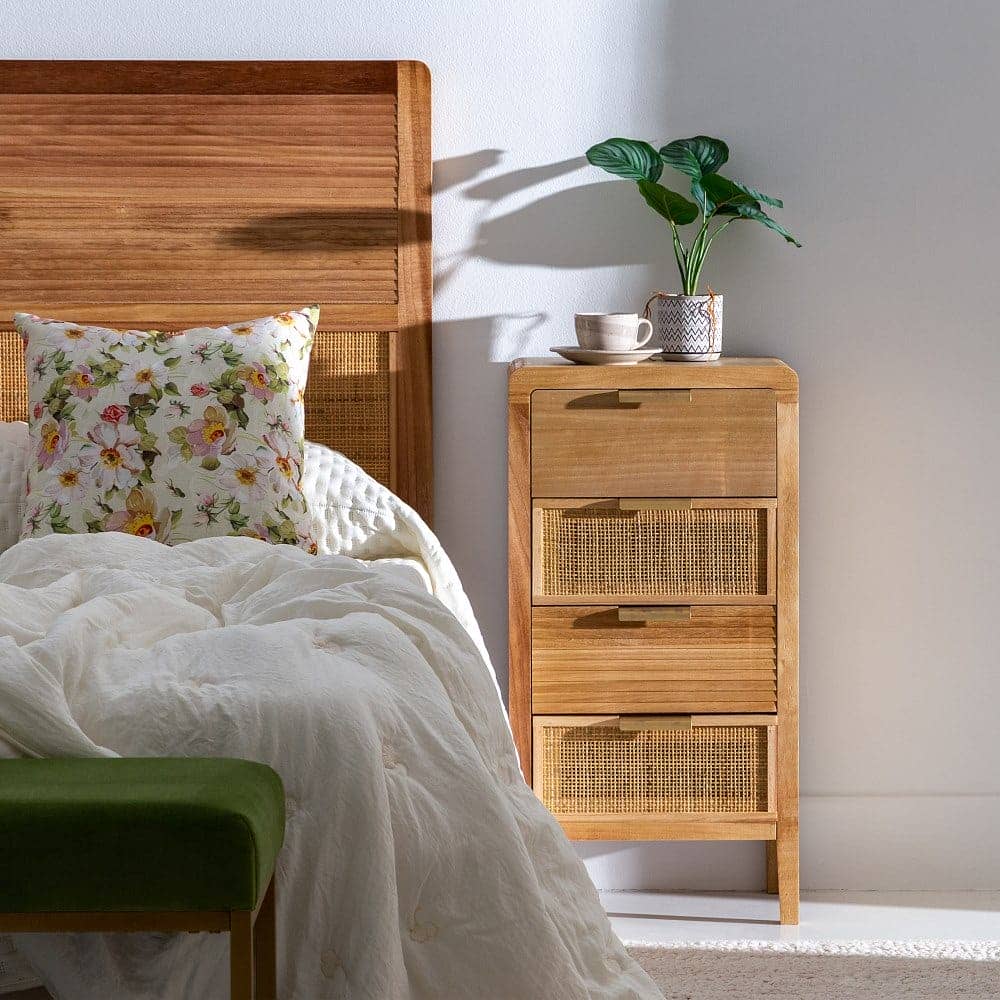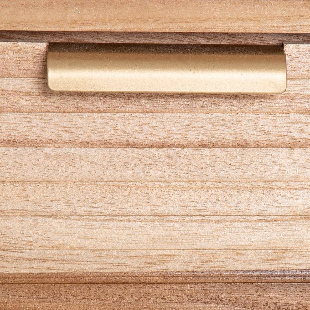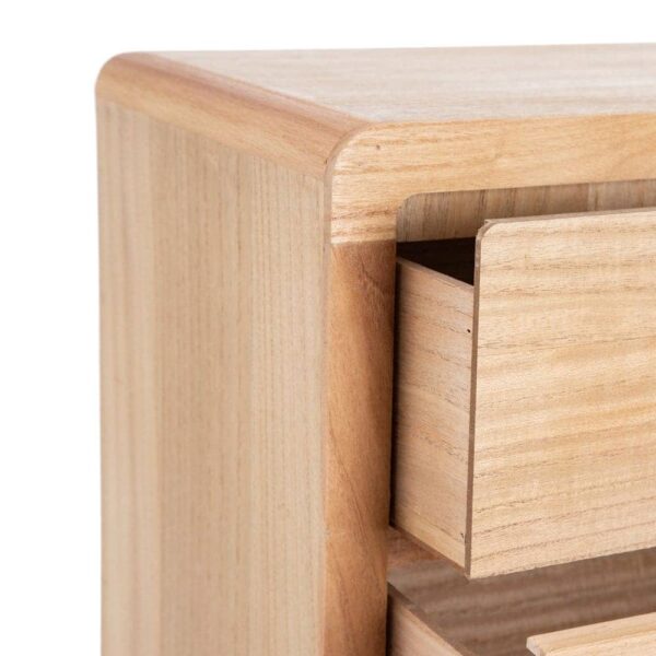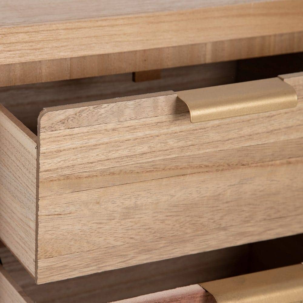 La mesita Natural Madera-Ratán es una pieza destacada de la colección *Honey*, fabricada en madera de paulonia y ratán, lo que le confiere un diseño robusto y cálido, ideal para cualquier dormitorio. Con unas medidas de 40 cm x 30 cm x 77,5 cm, cuenta con dos cajones de 34×15 cm perfectos para mantener tus objetos organizados. La altura de las patas de 12 cm aporta ligereza y un toque de elegancia. Además, su diseño no requiere montaje, lo que facilita su colocación en tu hogar. Su color natural complementa cualquier estilo, desde el rústico hasta el moderno. Con un peso de 8 kg, esta mesita es una opción práctica y sofisticada para tu habitación. ¡Descubre la calidad y el estilo con esta pieza única!