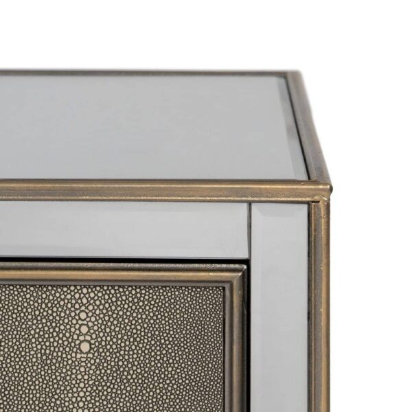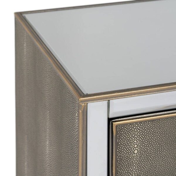 Con una estética moderna y sofisticada, esta mesita espejo es ideal para quienes buscan una pieza exclusiva que combine funcionalidad y elegancia. Su acabado en cristal, DM y simil piel la convierte en un mueble único, mientras que el diseño gris y plata aporta un toque de distinción a cualquier espacio.