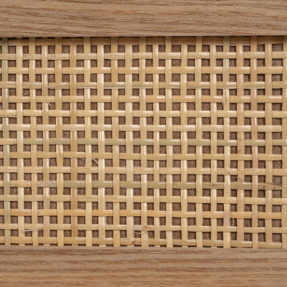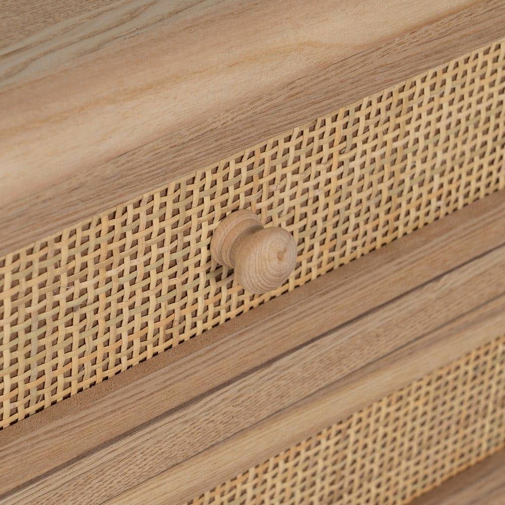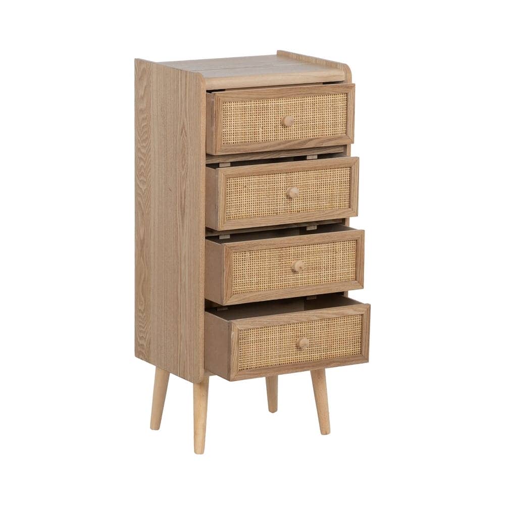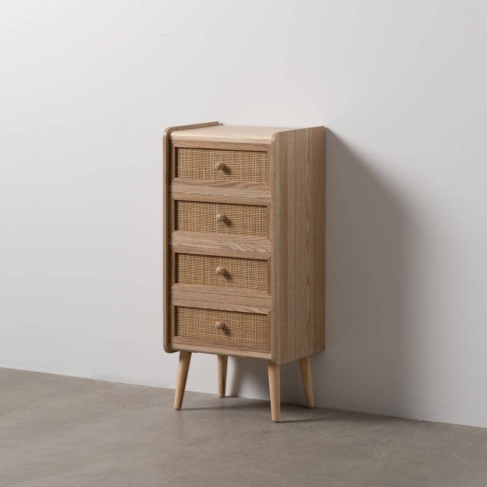 Material 4 cajones: DM y ratán. Medidas cajones: 37.5×14,5cm. Peso soportado en cada cajón: 8kgs. Material de la estructura: DM y madera de Paulonia. Material tiradores: Madera de pino. Altura de las patas:19,5 cm.