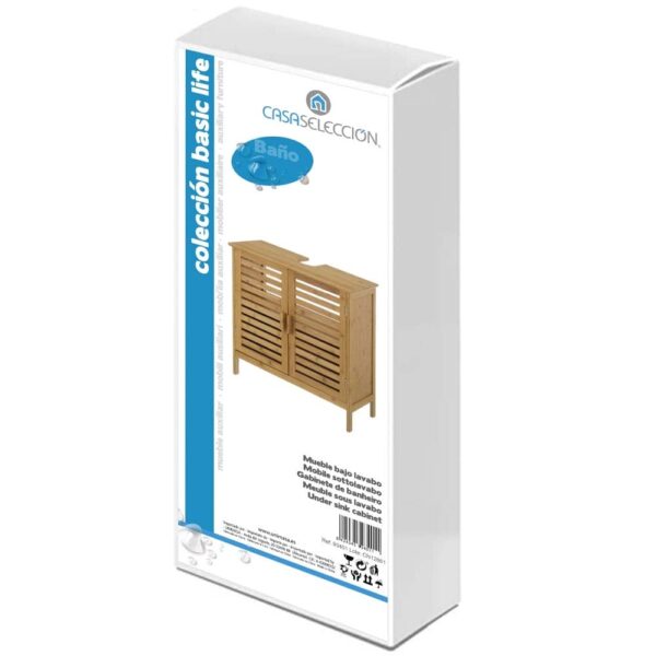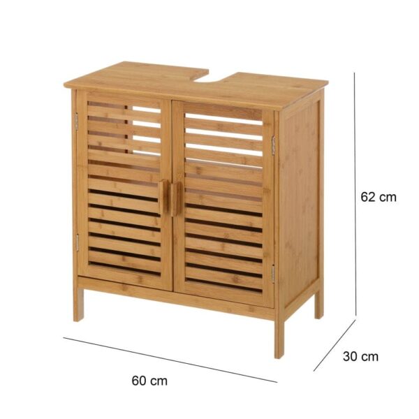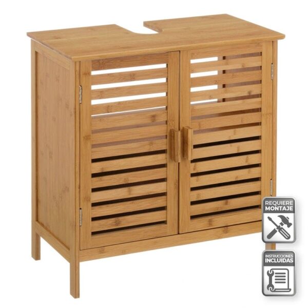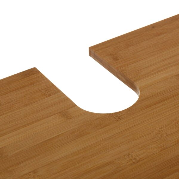 TABLERO DE BAMBÚ DE 15 MM. PARA LAVABO SUSPENDIDO. ALTURA PATA: 9 CM. MEDIDA PUERTA: 27X1,5X48 CM. ARMARIO CON BALDA. MEDIDA INTERIOR ARMARIO: 55,5X26,5X48 CM. MEDIDA HUECO PARA TUBERIA: 8X15X23 CM. PESO MÁXIMO SOPORTADO: 15 KG.