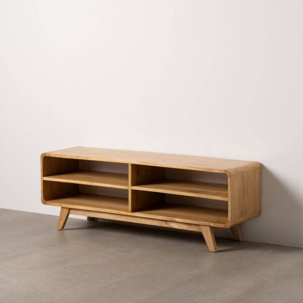 Elaborado en madera de mindi, conocida por su resistencia y belleza natural, este mueble TV presenta un acabado en color natural que resalta la textura única de la madera. Con medidas de 140 cm x 40 cm x 50 cm, es ideal para salones de tamaño mediano, ofreciendo un almacenamiento funcional sin ocupar mucho espacio. Los huecos de 66,5×14 cm son perfectos para almacenar dispositivos electrónicos o artículos decorativos, mientras que las patas de 16 cm de altura le proporcionan una base elegante y ligera. Su diseño atemporal se adapta a cualquier estilo de decoración, desde lo rústico hasta lo moderno. Con un peso de 28 kg, este mueble TV es sólido y duradero, convirtiéndose en una pieza clave para tu hogar. Añade estilo y organización a tu espacio con este mueble TV de madera mindi.