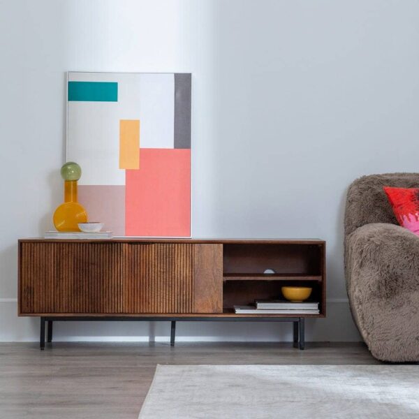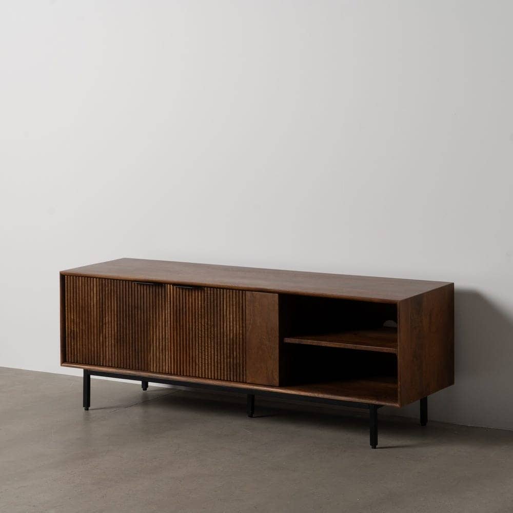 Aporta calidez y funcionalidad a tu salón con este mueble TV de diseño sofisticado. Fabricado en madera de mango con patas de hierro, su estética combina modernidad y naturalidad, ideal para espacios contemporáneos. Con prácticas puertas y huecos, organiza tus dispositivos con estilo. Haz que tu salón brille con este elegante mueble TV.