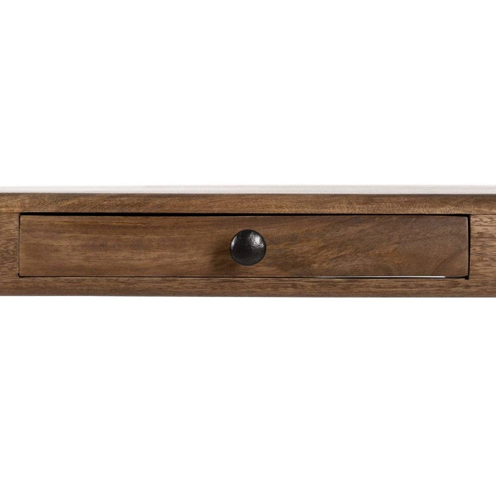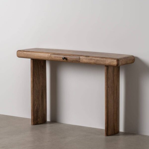 Con medidas de 120 cm x 35 cm x 76 cm, esta consola cuenta con un cajón de 34,5×4,5 cm, ideal para organizar tus objetos personales de forma ordenada. Su estructura robusta de madera de mango proporciona durabilidad, mientras que las patas de 68 cm ofrecen una altura perfecta para un acceso cómodo y estilizado. El color marrón de la madera resalta su belleza natural y se adapta fácilmente a diferentes estilos decorativos, aportando un aire rústico y elegante. Con un peso de 18 kg, esta consola es resistente, práctica y no requiere montaje, lo que te permitirá disfrutar de ella al instante. ¡Hazla tuya y transforma tu hogar con esta consola de diseño único y funcionalidad excepcional!