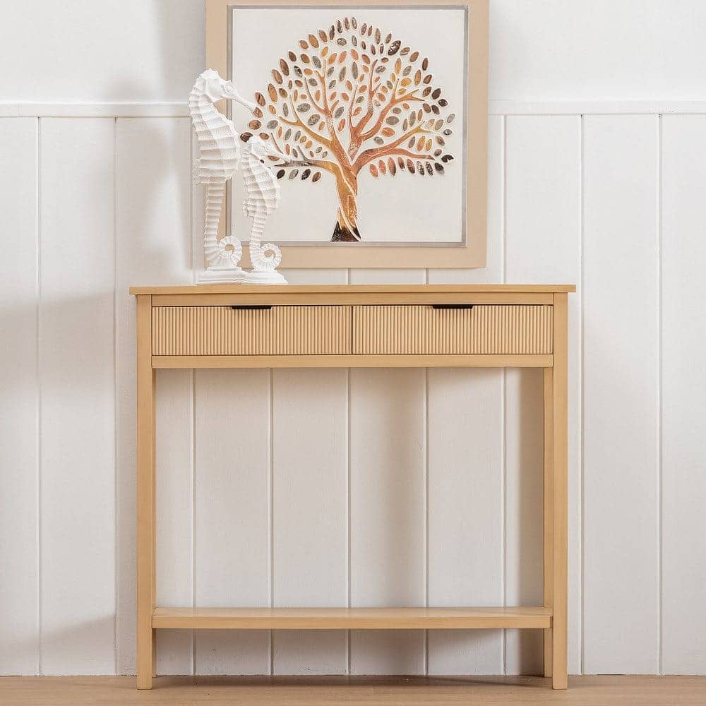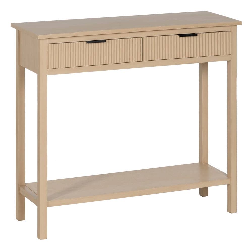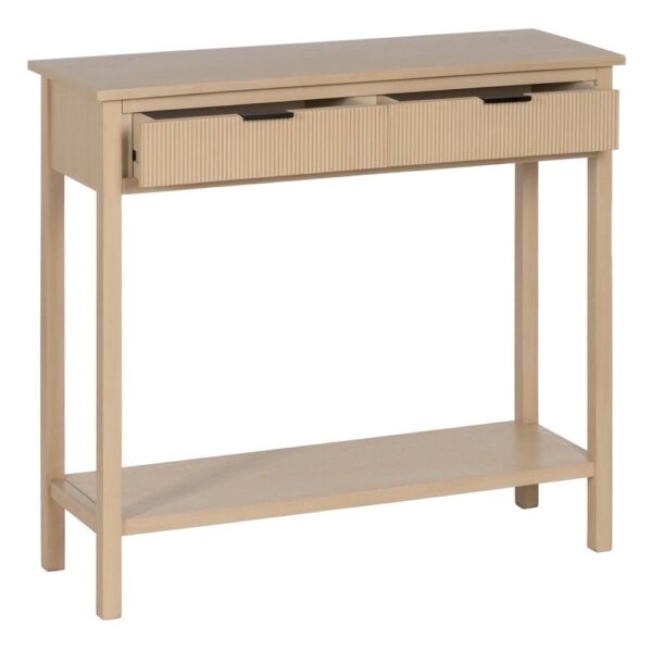 Con medidas de 90 cm x 30 cm x 81 cm, esta consola está fabricada con un top y cajones de DM, mientras que su estructura de madera de pino le da una solidez única. Los cajones de 40,5×10 cm ofrecen un espacio perfecto para organizar tus objetos, mientras que el hueco de 50 cm te permite almacenar artículos más grandes de forma ordenada. La altura de las patas hasta la leja es de 12 cm, lo que añade una sensación de ligereza a la pieza. Con un peso de 12 kg, esta consola es resistente, pero lo suficientemente ligera como para adaptarse a cualquier espacio. Su color natural le da un aire fresco y elegante, perfecto para cualquier estilo decorativo. ¡No dejes pasar la oportunidad de incorporar esta pieza que combina practicidad y estilo en tu hogar!