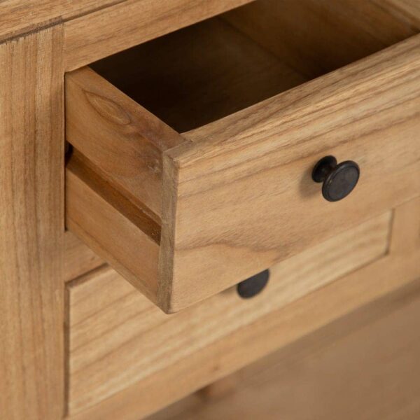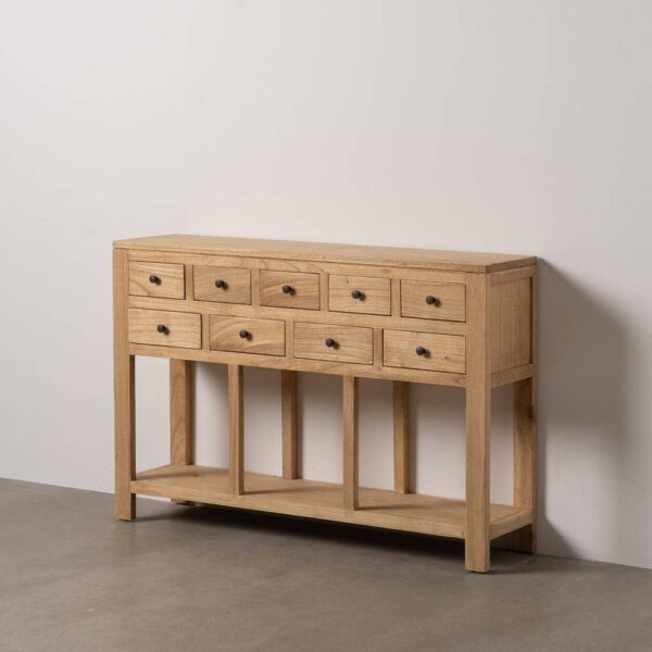 Con un diseño que combina lo natural y lo práctico, esta consola de madera mindi es perfecta para aportar calidez y funcionalidad a tu hogar. Fabricada en madera de mindi de alta calidad, su color natural y acabados impecables crean un ambiente acogedor y elegante. Con unas medidas de 120 cm x 30 cm x 80 cm, esta pieza destaca por sus 8 cajones amplios (de 19,5×10 cm cada uno), ideales para organizar de manera práctica y ordenada. Además, el hueco inferior de 36 cm ofrece espacio extra para almacenar o exhibir objetos decorativos. Las patas de 9 cm elevan la pieza, dándole una ligera apariencia que la hace perfecta para espacios modernos y tradicionales por igual. Atrévete a darle un toque único a tu hogar con esta consola elegante y versátil.