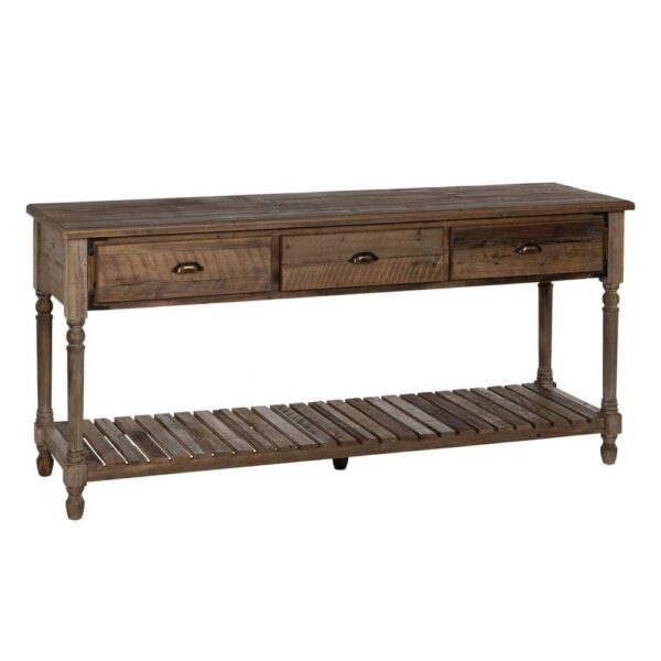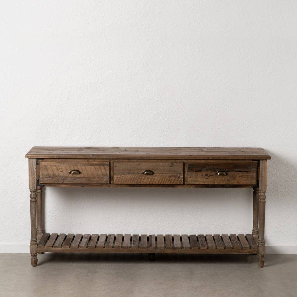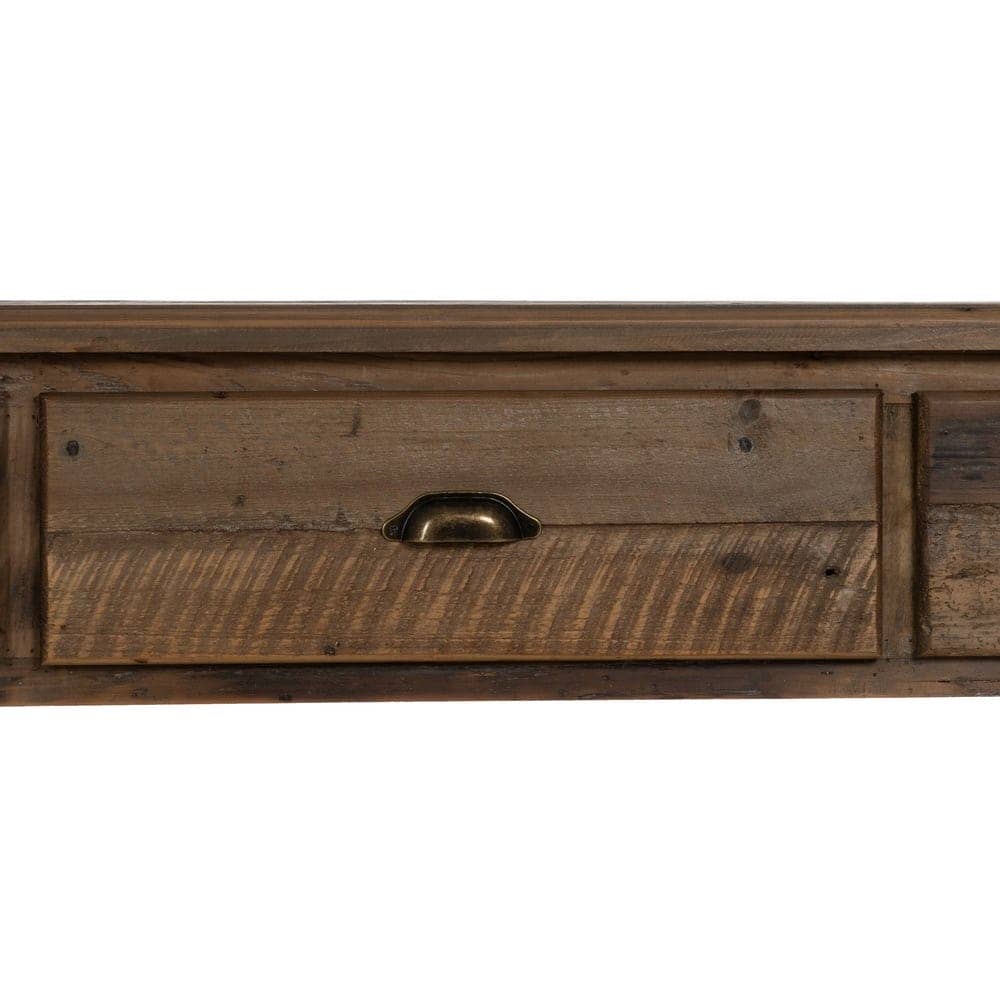 Con medidas de 184,5 cm x 50 cm x 86,8 cm, esta consola está fabricada con madera de abeto reciclada y DM, lo que le otorga una gran robustez y durabilidad. Los cajones de 53,5×17,5 cm proporcionan un amplio espacio de almacenamiento, perfecto para mantener tus objetos organizados. Con una altura de patas hasta la leja de 11 cm, la consola ofrece una estética moderna y elegante, ideal para adaptarse a grandes espacios como salones y comedores. El color marrón aporta calidez, mientras que su diseño moderno complementa cualquier estilo decorativo. Con un peso de 38 kg, es una pieza sólida y resistente, pero suficientemente ligera para ser colocada con facilidad. ¡No dejes pasar la oportunidad de incorporar esta consola que combina funcionalidad, estilo y sostenibilidad a tu hogar!