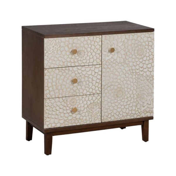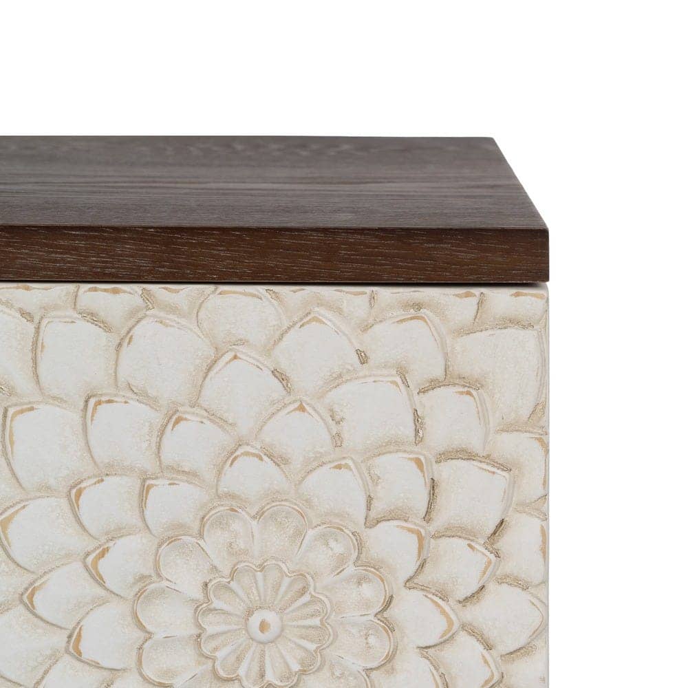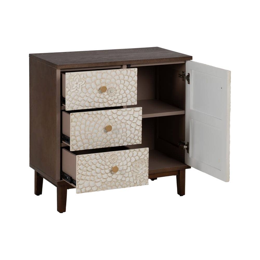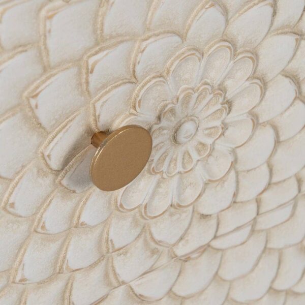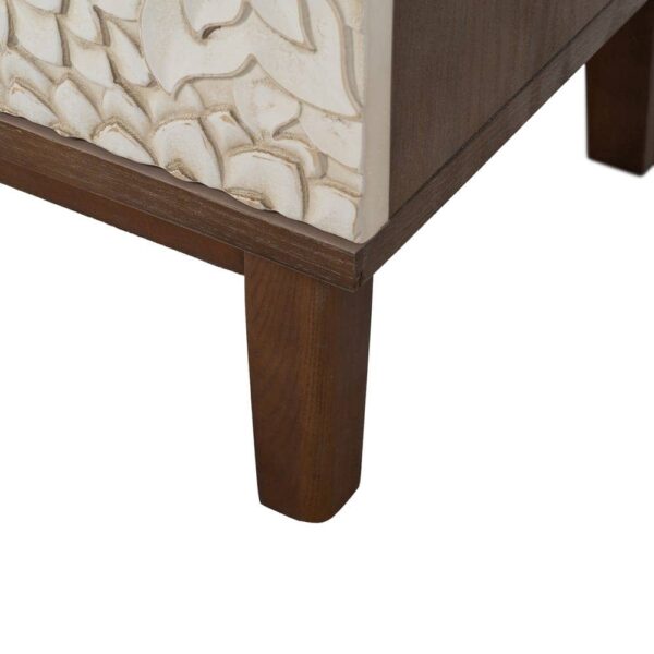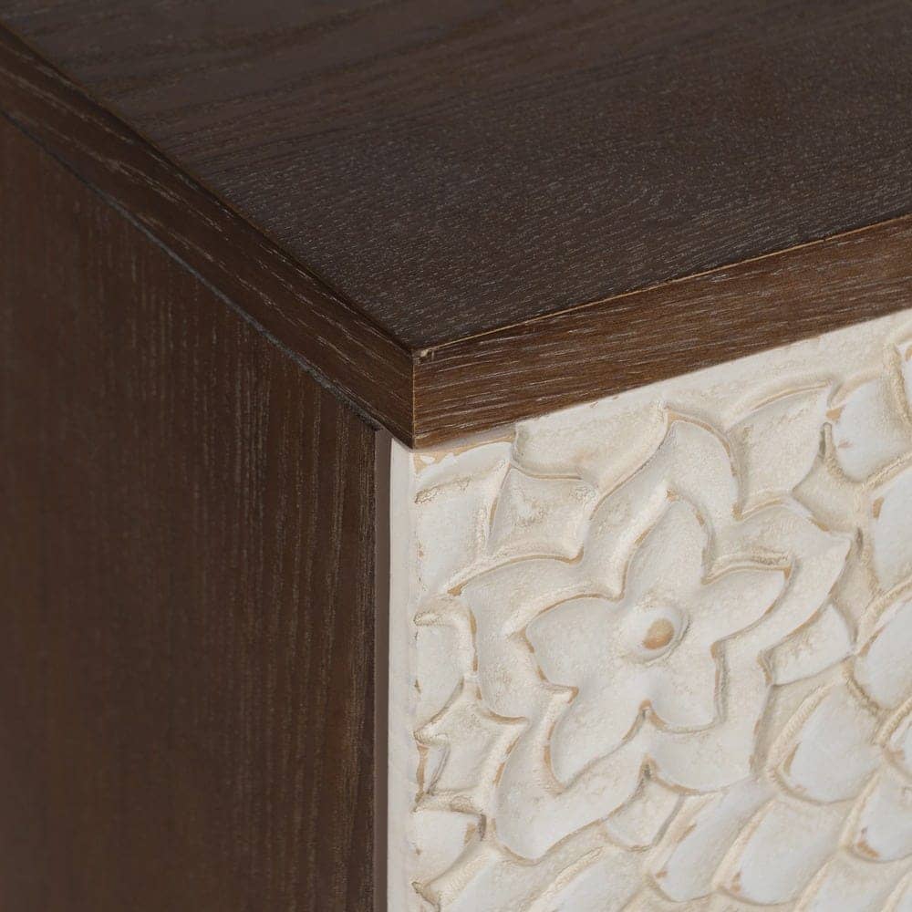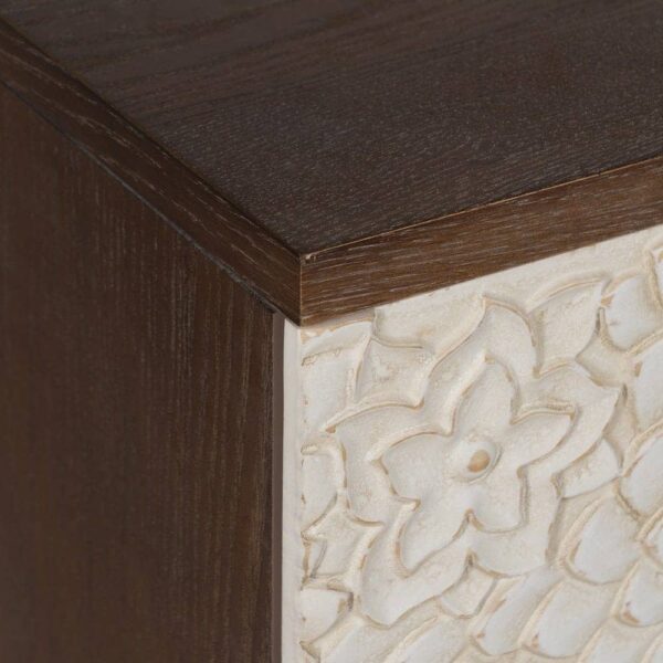 Aporta personalidad y elegancia a tu entrada con este mueble recibidor tallado de 80 cm. Con una estructura principal de madera de pino y detalles en DM, destaca por su acabado artesanal en blanco y marrón, que combina diseño clásico y moderno en perfecta armonía.