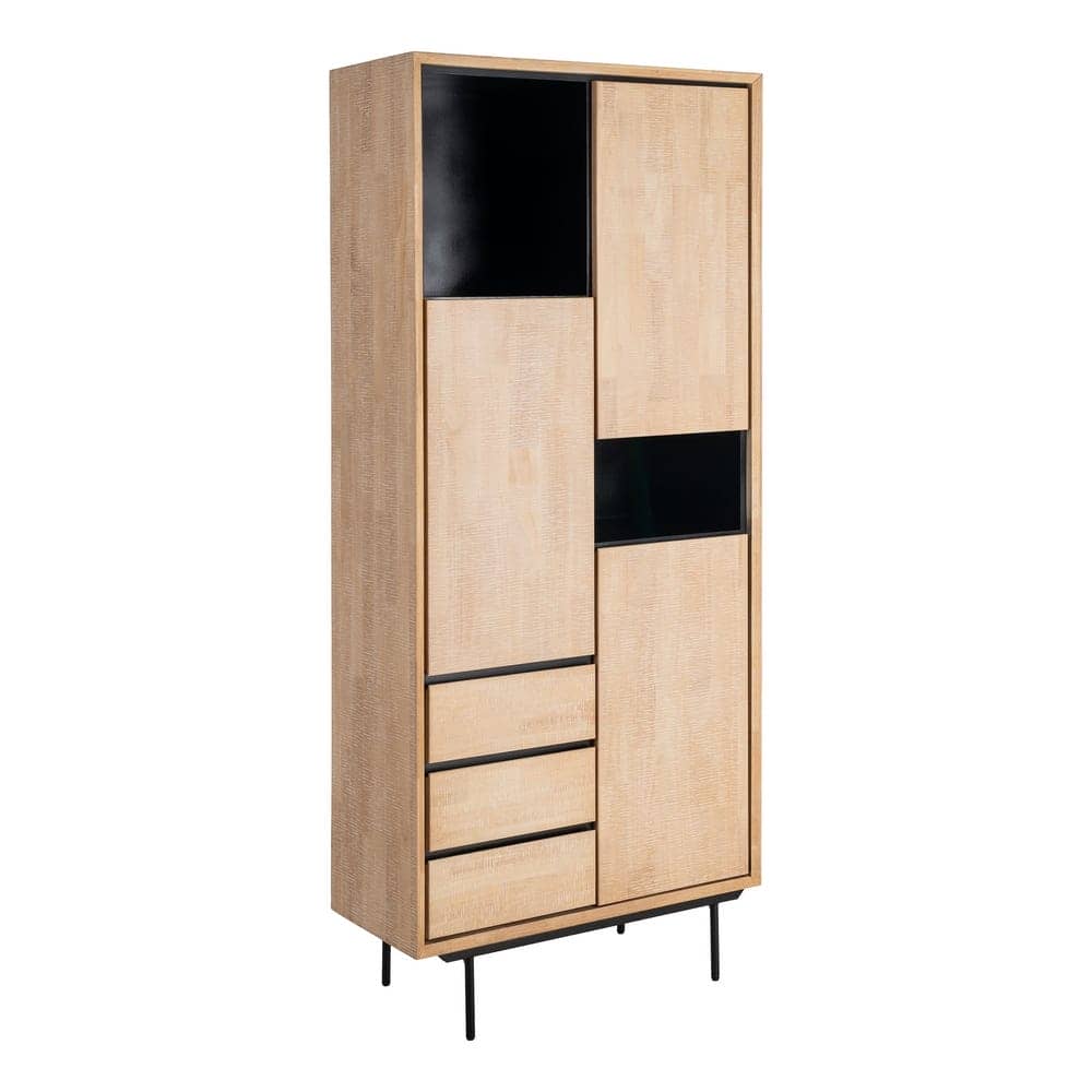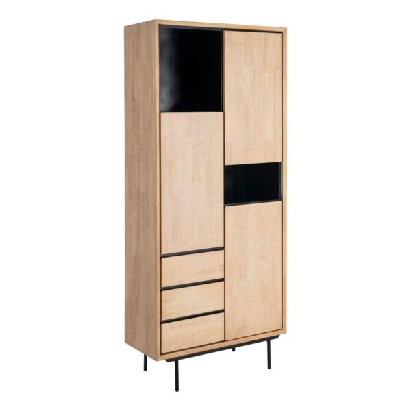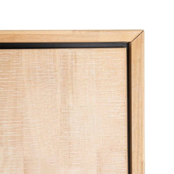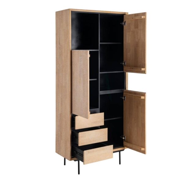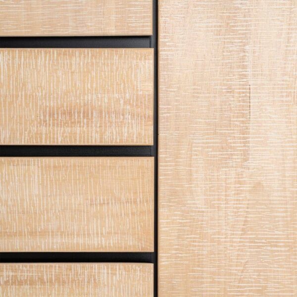 Material: estructura principal madera de caucho – Dm – metal. Patas: hierro (negro) Altura patas: 17cm. Medida cajones: 41x16cm. Medida puertas: 41×77.5cm. Medida huecos: 46×40 – 40x23cm. Lejas interiores a mitad de altura. Patas para montar.