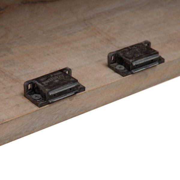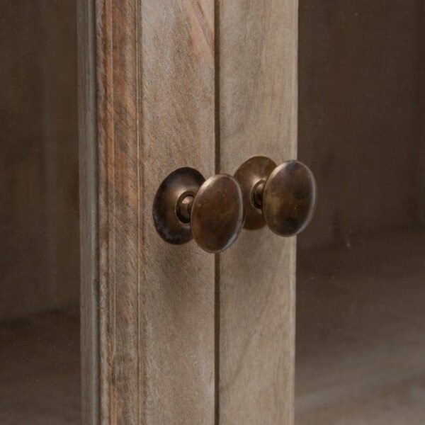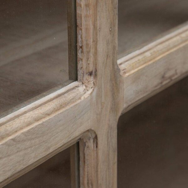 Fabricada en madera de mango, esta vitrina tiene un acabado blanco rozado, aportando una atmósfera fresca y contemporánea a tu espacio. Con unas medidas de 115 cm x 40 cm x 194 cm, es ideal para salones de tamaño grande o para crear un punto focal en cualquier habitación. Las puertas de 60×180 cm ofrecen un acceso práctico y elegante al interior, mientras que las 4 baldas interiores, con una altura aproximada de 33 cm, proporcionan un amplio espacio para tus objetos decorativos o de almacenamiento. La altura de las patas de 10 cm le da un toque estilizado, elevando la pieza sin perder estabilidad. Con un peso máximo soportado de unos 50 kg en total, esta vitrina es perfecta para almacenar artículos más pesados. Con un peso de 110 kg, es robusta y duradera, garantizando una larga vida útil. Añade elegancia y funcionalidad a tu salón con esta vitrina que combina belleza, calidad y diseño en una sola pieza.